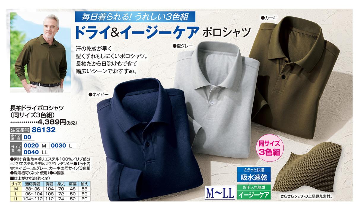 3. 長袖ドライポロシャツ(同サイズ3色組)
