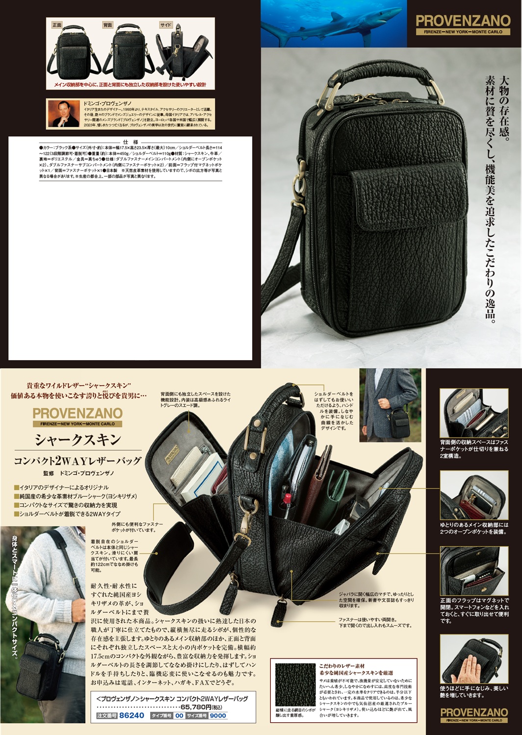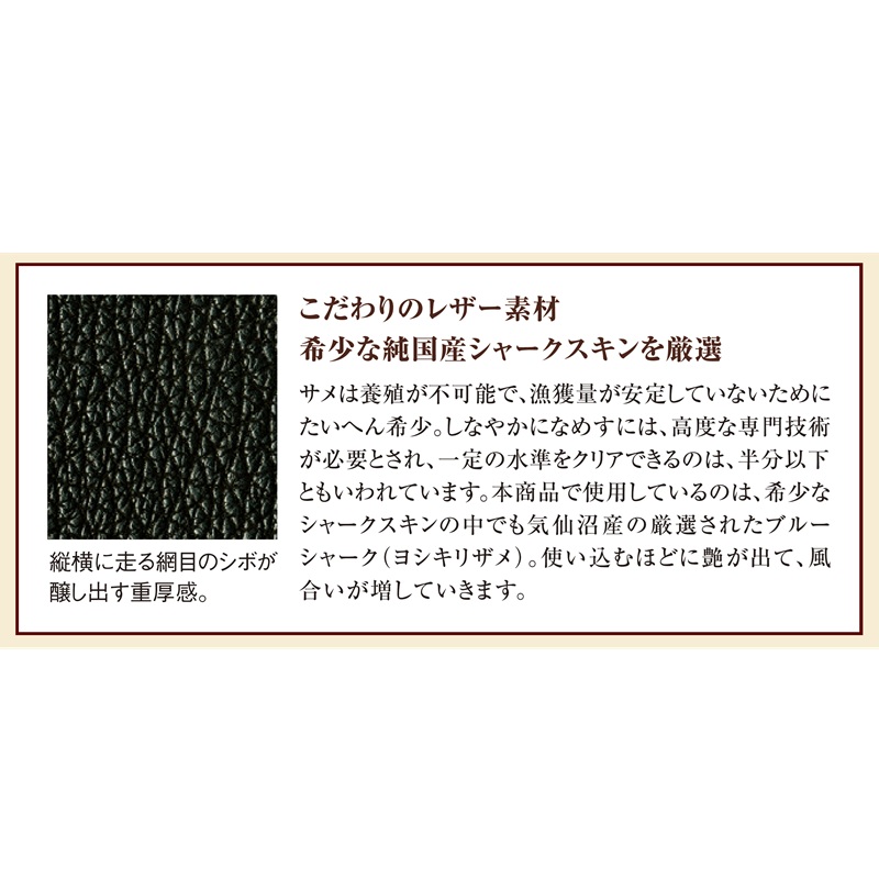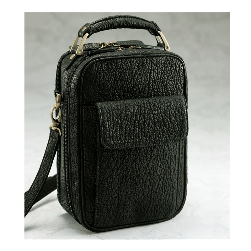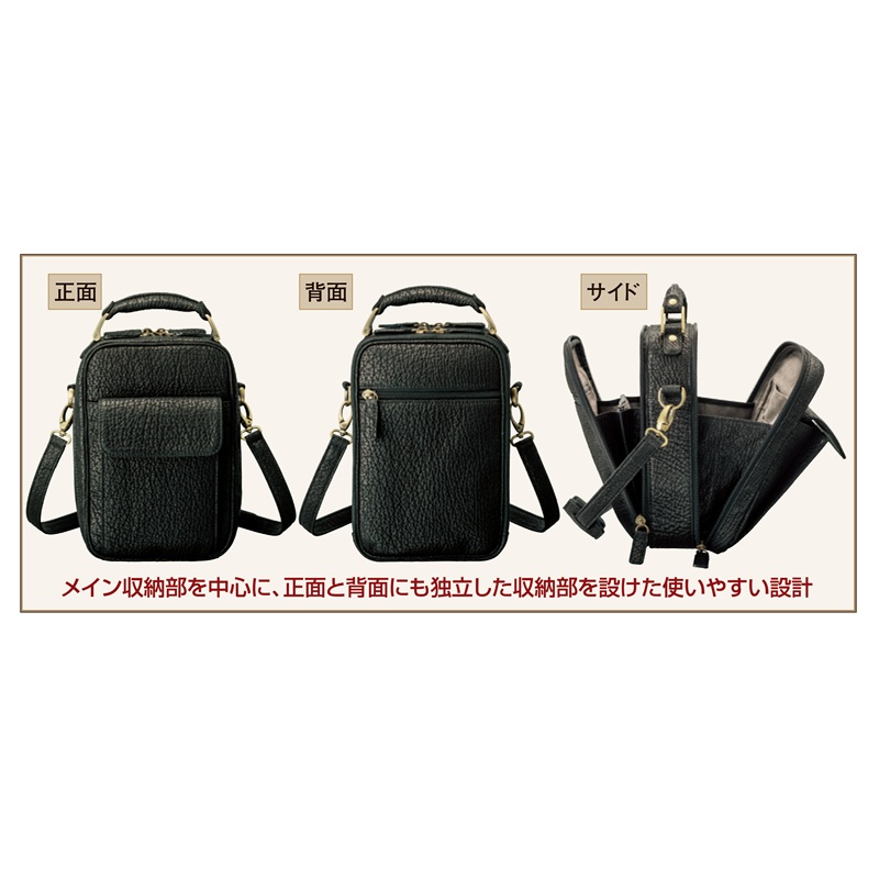 ●カラー:ブラック系 ●サイズ(外寸・約):本体=幅17.5×高さ23.5×厚さ(最大)10cm/ショルダーベルト長さ=114~122(3段階調節可・着脱可) ●重量(約):本体=450g/ショルダーベルト=110g ●材質:シャークスキン、牛革/裏地=ポリエステル/金具=真ちゅう ●仕様:ダブルファスナーメインコンパートメント(内側にオープンポケット×2)、ダブルファスナーサブコンパートメント(内側にファスナーポケット×2)/前面=フラップ付マグネットポケ ット×1/背面=ファスナーポケット×1 ●日本製 ※天然皮革素材を使用していますので、シボの出方等が写真と異なる場合があります。 ※生産の都合上、一部の部品が写真と異なります。