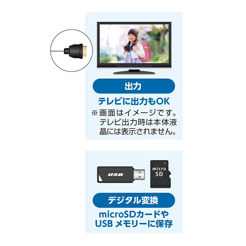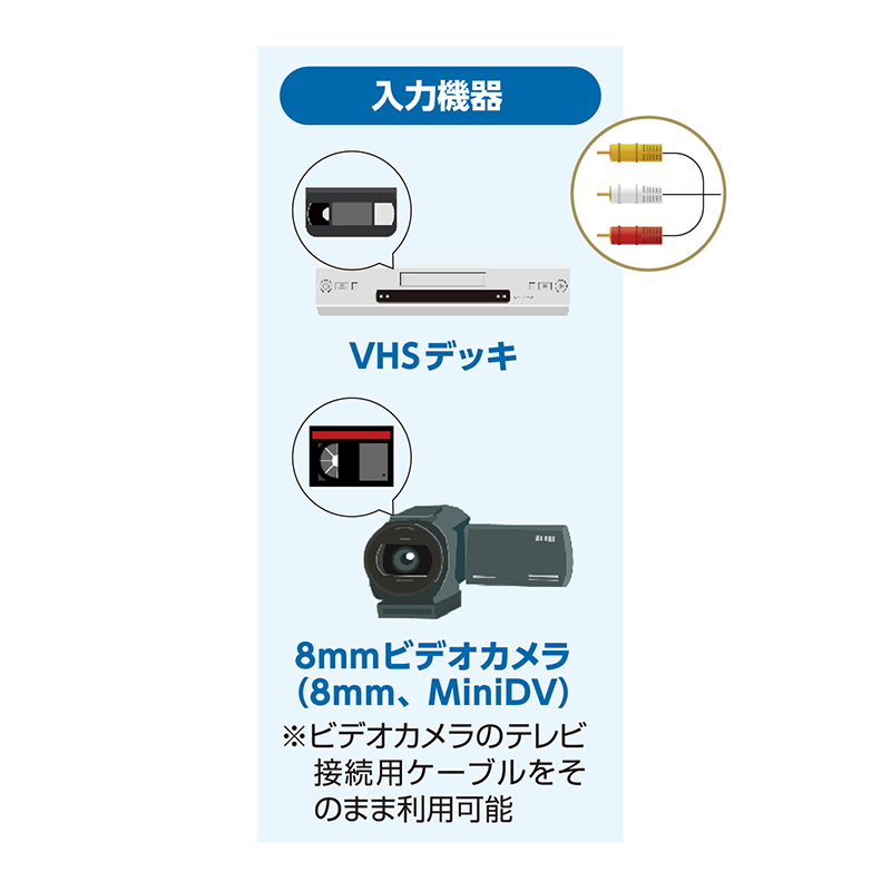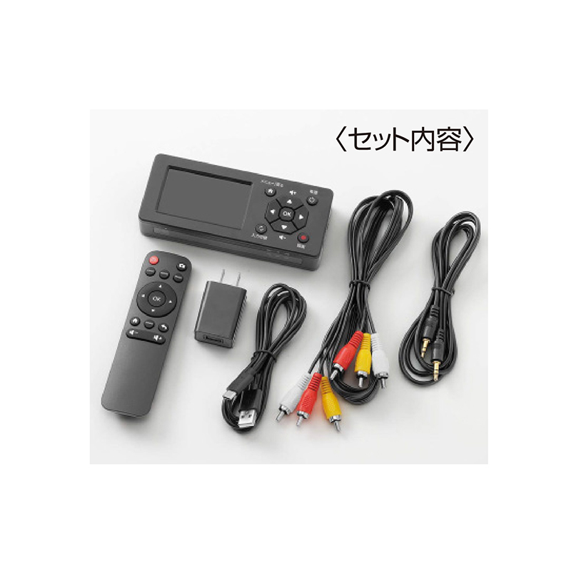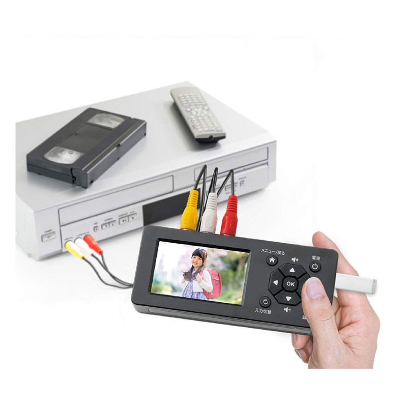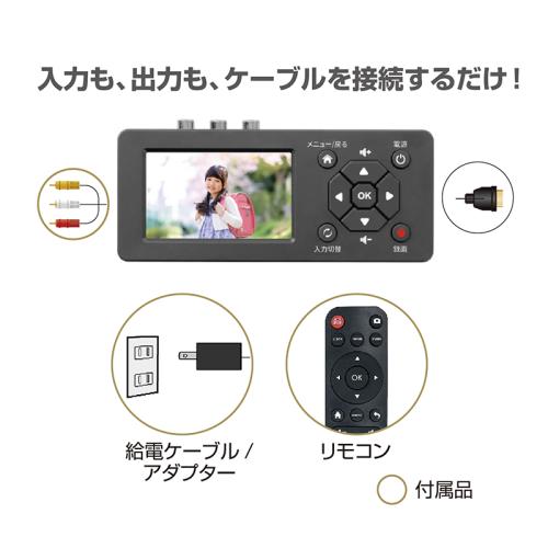 パソコン不要!思い出のつまったビデオテープを、かんたん手軽にデジタル化。 VHS・8mm・MiniDVの映像を、パソコンを使わずかんたんにデジタル変換。本体モニターで映像を確認しながら操作でき、映像は、microSDカードやUSBメモリーにMP4形式で保存が可能です。家電を処分する前に、大切な思い出を残しませんか。 ●サイズ(外寸・約):幅14.3×奥行2.7×高さ6cm/コード長さ=約1.5m(USB給電ケーブル・AVケーブル・オーディオケーブル共通) ●重量(約):126g ●材質:ABS樹脂 ●消費電力:0.5A ●電源:DC5V●仕様:液晶サイズ=3インチ/解像度640×480ピクセル/入力端子(録画)=[映像]RCA黄(コンポジット)、Sビデオ[音声]RAC赤、白/入力端子(録音)=AUX IN(3.5mmミニ/ LINE IN)/出力端子=HDMI=1920×1080ピクセル、60Hz、AUX OUT(3.5mmミニ/LINE OUT)※音声のみ/搭載スピーカー=1W ●付属品:リモコン、USBーACアダプター(5V/1A)、USB給電ケーブル、AVケーブル(RCAピンプラグ)、オーディオケーブル(3.5mmミニプラグ) ●中国製 ※microSDカード、USBメモリー、HDMIケーブル、S端子ケーブル、リモコン用単4形乾電池(2本)は付属しておりません。 ※ご使用後の返品・交換はお受けできません。 ◆【86333】と【AA898】は同じ商品です。