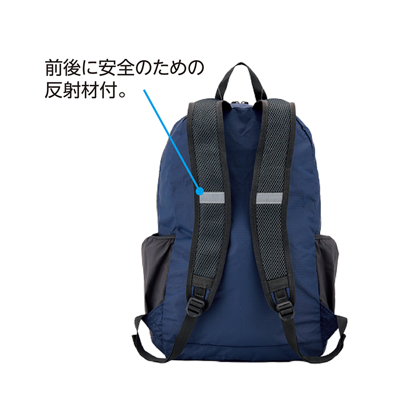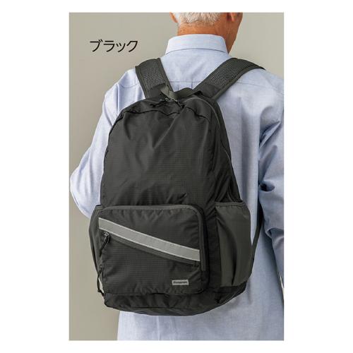荷物が増えても大丈夫。たためるサブバック。 小さくたたんで、フロントポケットに収納可能なポケッタブルバックパック。サブバッグとして重宝します。通気性のあるメッシュショルダーベルトで快適な背負い心地です。●サイズ(外寸・約):使用時=幅30×高さ47×厚さ17cm/持ち手高さ=7cm/収納時=幅24×高さ19×厚さ4.5cm ●重量(約):300g ●容量(約):27L ●材質:本体=リップストップナイロン(210D)/ショルダーベルト=ポリエステルメッシュ ●仕様:ダブルファスナーメインコンパートメント/前面=ファスナーポケット×2/側面=オープンポケット×2 ●中国製