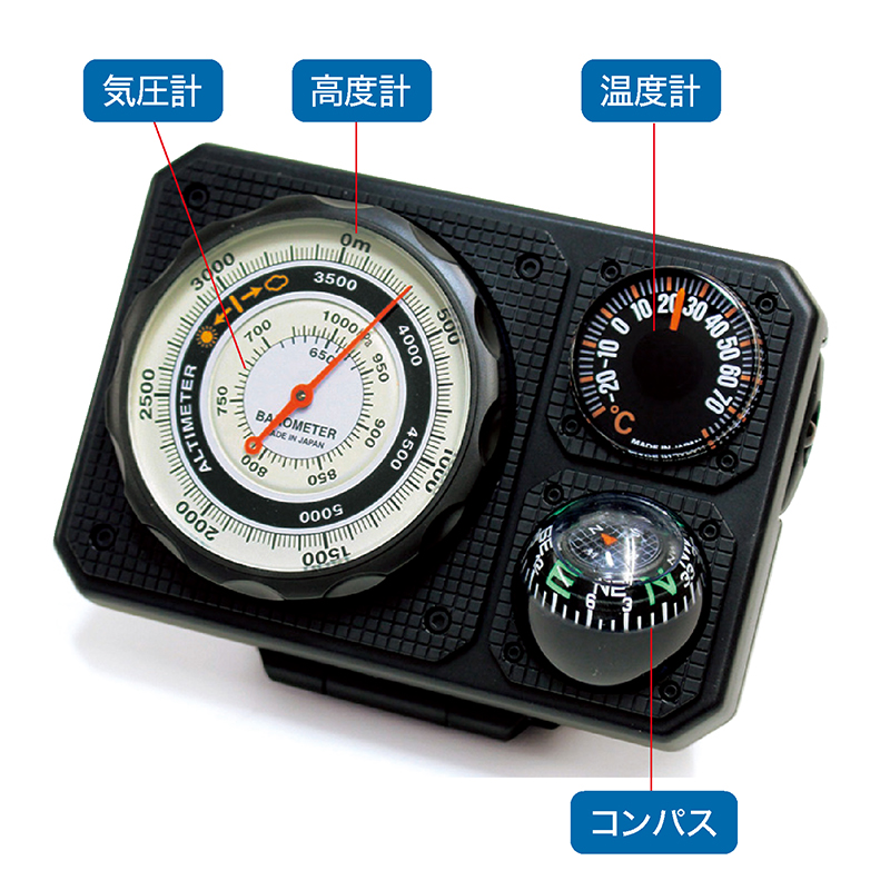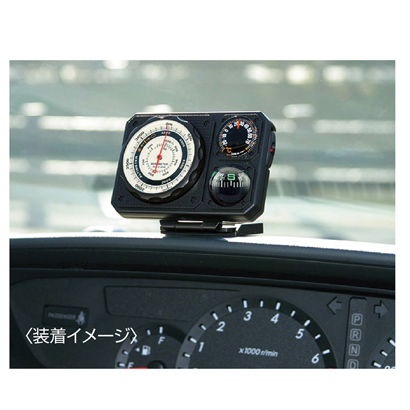 アウトドアやドライブで便利な6つの機能が便利度アップ。 ドライブ時やアウトドアで活躍する「コンパス」「温度計」「高度計」「気圧計」はもちろん、暗がりで役立つ「ミニLEDライト」や光を反射させてSOSを知らせるための「信号用ミラー」も付いた充実のアイテムです。台座から取り外せば、登山用アイテムとして持ち歩けます。●サイズ(約):幅10.5×高さ7.2×奥行4cm ●重量(約):120g ●材質:ABS樹脂、他 ●ミニLEDライト電源:LR44ボタン電池×2(付) ●仕様:高度計(0~5000m)、気圧計(アネロイドタイプ)、温度計(-20~+70度)、コンパス(正方位、対面方位)、ミニLEDライト(赤色)、信号用ミラー ●日本製 ◆【86357】と【AA862】は同じ商品です。