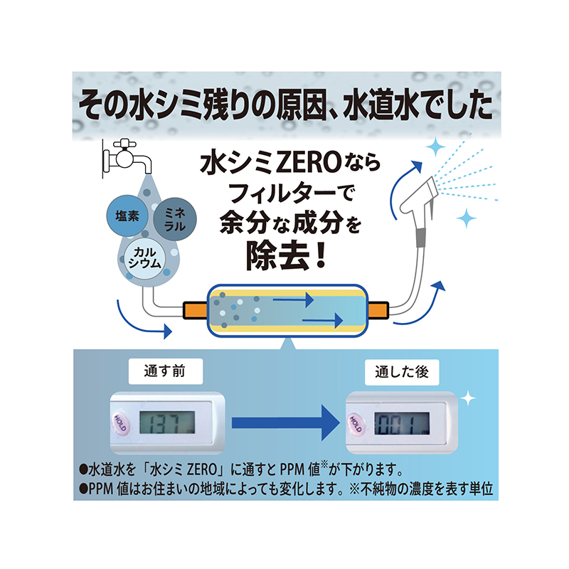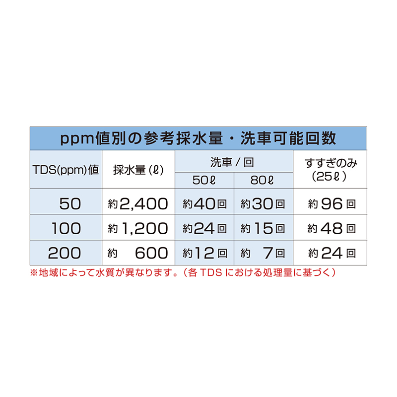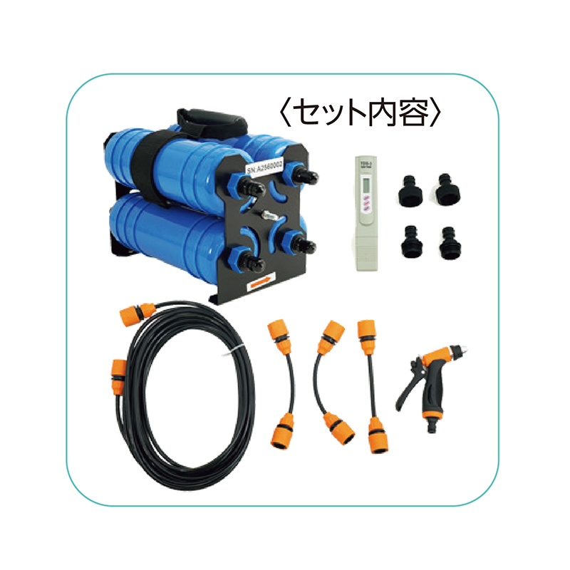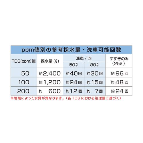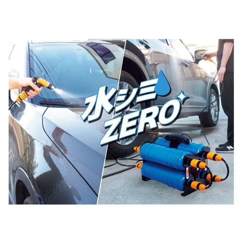 水道に取り付けるだけで、純水に!! 水シミZEROで、さあ、安心洗車! 4つのフィルターを通った水は、水中の不純物がろ過され、純水になります。純水で水シミ残りを軽減して、安心洗車。拭き上げがとっても楽になり、洗車時間も大幅に短縮できます! TDSメーター付で水中の不純物濃度をチェックできます。 ●サイズ(約):本体=幅19×奥行37×高さ20.5cm ●重量(約):5.6kg ●材質:本体=ポリプロピレン/ホース=ポリプロピレン、ポリウレタン/固定用プレート=鉄/グリップベルト=ナイロン/リング=シリコーン ●仕様(約):純水採水量=2400L(TDS 50ppmでの相当での測定値/タンク容量=1L(タンク1個当たり)/フィルター=イオン交換樹脂 ●セット内容:フィルター×4、フィルター固定用プレート×2、蝶ナット×1、ボルト×1、水道用ニップル凸・凹×各6、ニップル用キャップ×8、接続用ホース(短)×3、接続用ホース(長)×1、TDSメーター×1(テスト用ボタン電池×2付)、ノズル×1、グリップベルト×1、シリコンリング×4 ●中国製 ※本製品は水中の不純物を低減しますが、完全に除去できるものではありません。地域の水質や使用条件によっては水シミや跡が残る場合があります。 ※水道給水用の蛇口コネクター、ホースジョイント、ホースは付属しません。 ※ご使用後の返品・交換はお受けできません。