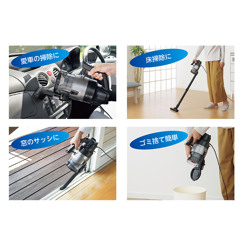 家、車、ガレージ。これ1台でどこでもお掃除! 電源コードは約6m。プラグ差し替えの手間が省け、車やガレージも隅々まできれいに。4種類の付属アタッチメントを組み合わせれば、カーペット、窓サッシ、エアコンの上まで、家中掃除できます。 ●カラー:メタリックグレー ●サイズ(約):本体=幅14.5×奥行29×高さ22cm/電源コード長さ=6m ●重量(約):1.9kg ●材質:本体=ABS樹脂、他/延長パイプ・お手入れブラシ・アタッチメント収納袋=ポリプロピレン ●消費電力:750W ●電源:AC100V ●仕様(約):集じん方式=サイクロン式/集じん容量=0.7L/吸込仕事率=200W ●騒音値:75dB以下 ●付属品:延長パイプ×2、床用吸込口×1、すき間ノズル×1、ソフトブラシ×1、アタッチメント収納袋×1、お手入れブラシ×1 ●中国製 ※シガーライターソケットからは給電できません。 ※ご使用後の返品・交換はお受けできません。