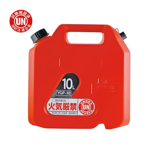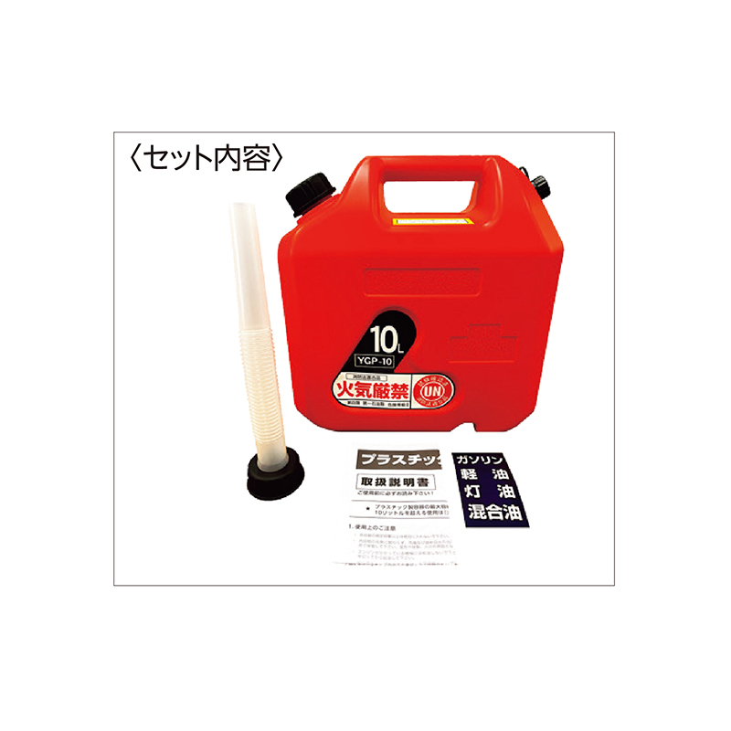 ガソリンをプラスチック製容器でも10リットルまで携行できるようになりました。 消防法適合品UN試験確認の安全規格をクリアした、ガソリン携行プラスチック製容器。軽量・コンパクトで持ち運びに便利。エア調整キャップがあるため、エア抜きが簡単で安全に使え、給油時の排出時間も短縮。軽油、灯油、混合油にもご利用いただけます。 ●カラー:レッド ●サイズ(外寸・約):幅30×高さ30.4×奥行17.3cm/ノズル長さ=27cm ●重量(約):980g(ガソリン10L保管時8.5㎏) ●容量:10L ●材質:本体=高密度ポリエチレン/ノズル=低密度ポリエチレン、ポリアミド ●付属品:給油ノズル、内容物表示ステッカー ●中国製 ※セルフ式ガソリンスタンドではご自身での給油はできません。 ※ご使用の際は必ず取扱説明書をお読みになり、正しくお使いください。 ※ご使用後の返品・交換はお受けできません。