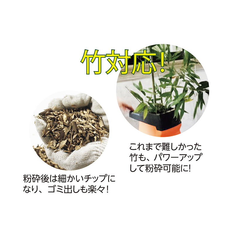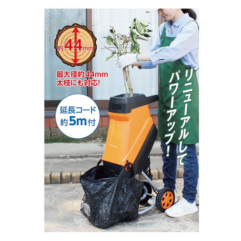 竹も粉砕できます! 強力! 枝シュレッダー。 これまで要望が多かった竹に対応!繊維の強い竹までも切断可能になった枝シュレッダーです。最大径約4.4cmまでの枝を粉砕でき、簡単ボタンや移動が楽な大型タイヤ、安全装置付で、使いやすさにも優れます。 ●サイズ(約):本体外寸=幅37.5×奥行49×高さ100cm/電源コード長さ=20cm/延長コード長さ=5m ●重量(約):10.3kg ●材質:炭素鋼、樹脂、スチール、他 ●電源:AC100V ●消費電力(約):1500W ●定格時間(約):30分 ●作動音:106dB ●粉砕最大径:44mm ※木の種類、状態によって異なります。 ●延長コード定格:15A-125V・1500W ●セット内容:本体、ダストバッグ、押込棒、延長コード ●組立式 ●組立参考時間(約):15分 ●中国製 ※周囲の安全を確認の上、十分注意してご使用ください。 ※お届けまで約2週間かかる場合があります。 ※ご使用後の返品・交換はお受けできません。