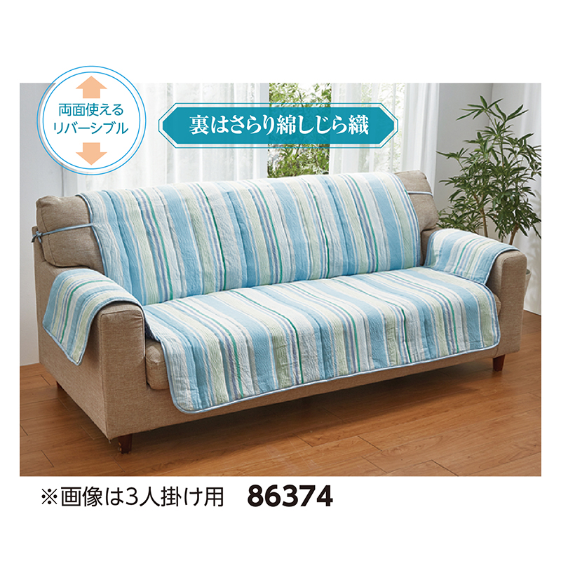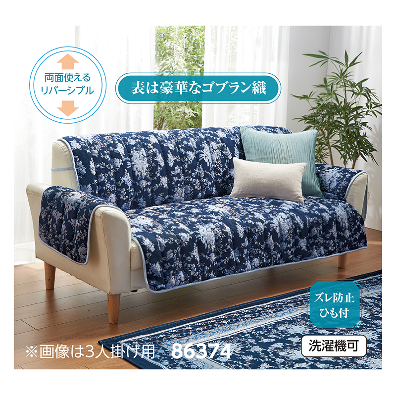 安心清潔わたを使用した2つの表情が楽しめるソファカバー。 季節やお好みに合わせて、豪華なゴブラン織と爽やかな綿しじら織がリバーシブルで楽しめます。中わたは防ダニ&抗菌防臭加工を施したテイジン「マイティトップⅡECO」を使用。汚れたらご家庭で洗えます。 ●カラー:表=ネイビー系/裏=ブルー系 ●サイズ(約):座面部=幅100×長さ160cm/肘掛部=縦45×横55cm(片側) ●重量(約):890g ●材質:表地=ポリエステル100%/裏地=綿100%/中わた=ポリエステル100% ●仕様:ズレ防止紐付 ●洗濯機可 ●中国製 ※商品の性格上、一点一点柄の出方等が異なります。