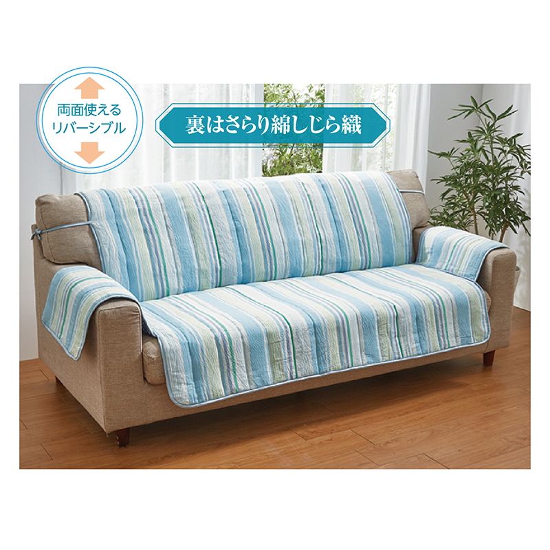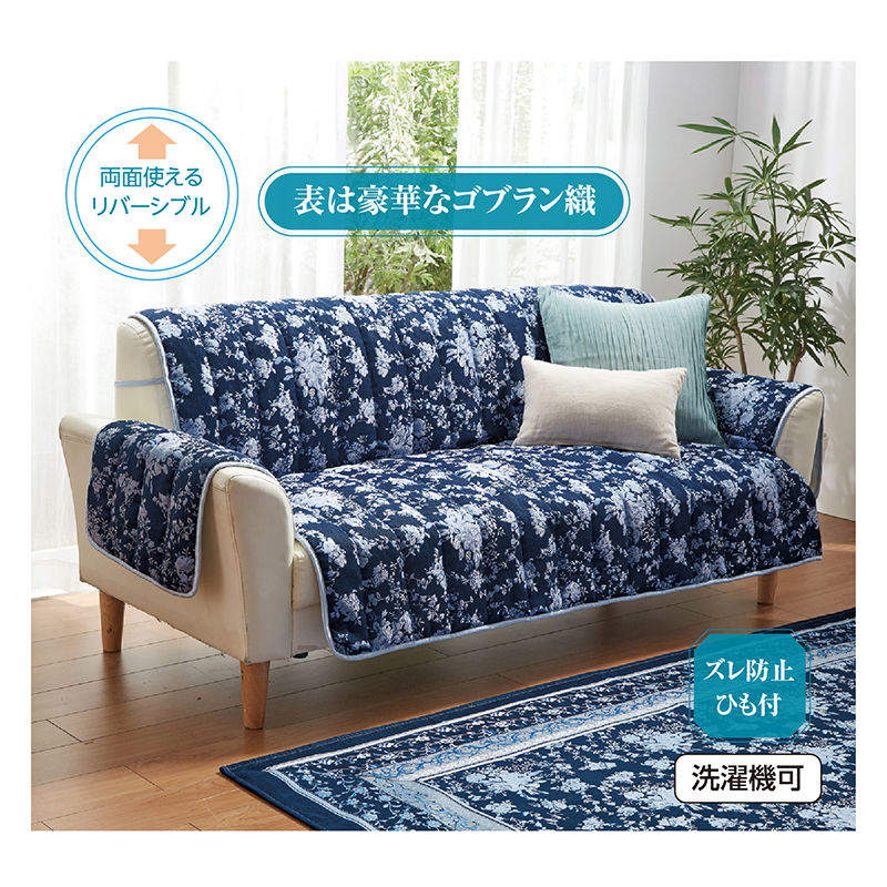 安心清潔わたを使用した2つの表情が楽しめるソファカバー。 季節やお好みに合わせて、豪華なゴブラン織と爽やかな綿しじら織がリバーシブルで楽しめます。中わたは防ダニ&抗菌防臭加工を施したテイジン「マイティトップⅡECO」を使用。汚れたらご家庭で洗えます。 ●カラー:表=ネイビー系/裏=ブルー系 ●サイズ(約):座面部=幅150×長さ160cm/肘掛部=縦45×横55cm(片側) ●重量(約):1.2kg ●材質:表地=ポリエステル100%/裏地=綿100%/中わた=ポリエステル100% ●仕様:ズレ防止紐付 ●洗濯機可 ●中国製 ※商品の性格上、一点一点柄の出方等が異なります。