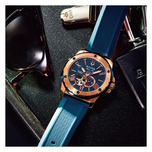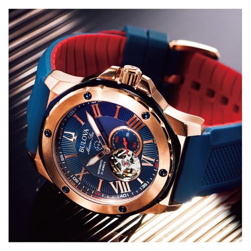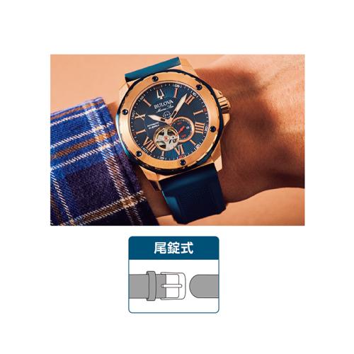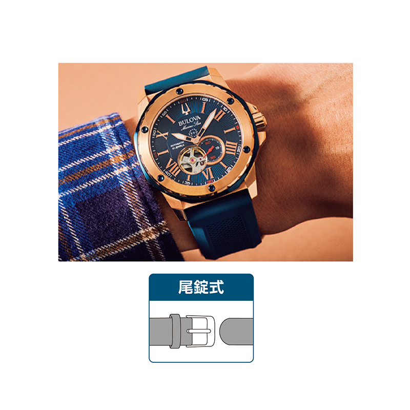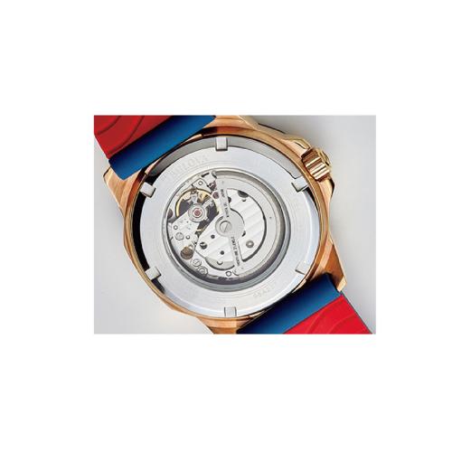 美しい誘惑。人気の「マリンスター」自動巻きモデル。 ローズゴールドPVDケース×ネイビーフェイス。20気圧防水マリンモデルで魅せる、スポーティーな表情とラグジュアリーデザインの融合。7時のオープンハートから、テンプの動きを楽しめます。 ●カラー:ブルー ●サイズ(約):直径45×厚さ13.45mm/適応手首周り=16~22cm ●重量(約):120g ●材質:ケース=ステンレス(ローズゴールドPVDコーティング+ブルーPVDコーティング)/ベルト=シリコンラバー/風防=ミネラルガラス ●仕様(約):日本製機械式ムーブメント(自動巻き)、静止状態での平均日差-20~+40秒、20気圧防水、駆動目安時間42時間(最大巻上時)、42時間パワーリザーブ、21石、ねじ込み式リューズ、シースルーバック、オープンハート、スクリューバック ●留め具:尾錠式 ●キャリバーナンバー:82S5 ●中国製 ※精度は静的状態で測定したものです。 ※機械式時計の特性上、使用される条件(携帯時間、時計の姿勢、腕の動き、ゼンマイの巻上具合など)によって、日差範囲を超える場合があります。