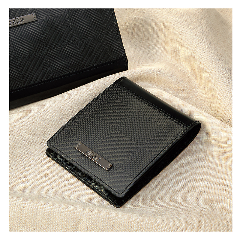 伝統の西陣織で、高強度カーボン繊維を織る。市松柄の気品が漂う、強さと美しさの逸品。 伝統の西陣織でカーボン繊維を日本古来の市松柄に織り上げました。オートクレープポリウレタン加工を施した、高い耐久性と上品な光沢が魅力。強度が求められる曲げ部分にはコードバンを使用しています。 ●カラー:ブラック系 ●サイズ(外寸・約): 幅9.3×高さ12×厚さ2.2cm ●重量(約):97g ●材質:表地=西陣織カーボンシート(カーボンファイバー、ポリウレタンオートクレープ加工)、コードバン/裏地=レーヨン、他 ●仕様:札入れ×2、ボックス式小銭入れ×1、カード入れ×10、オープンポケット×1 ●日本製 ※商品の性格上、一点一点柄の出方が異なります。