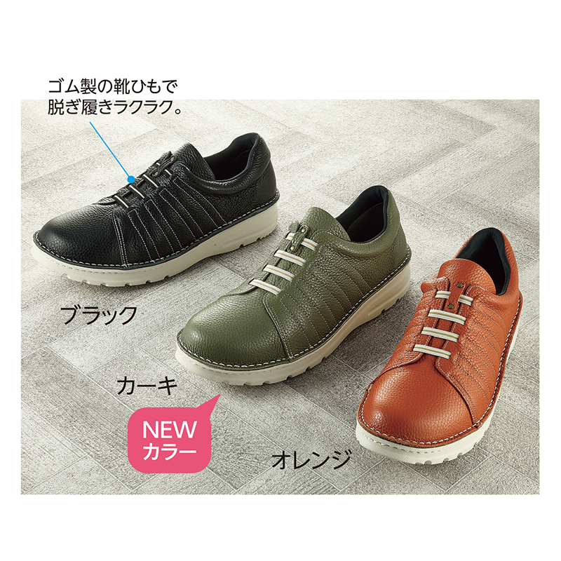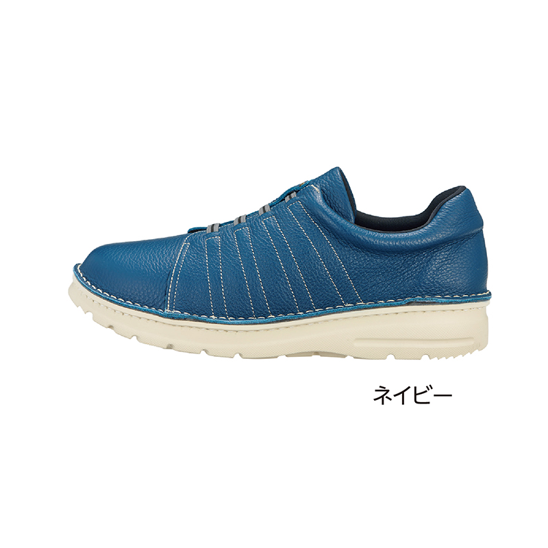 カジュアルな中に上質感の漂うレザースニーカー。徹底した軽量化が実現した歩き心地のよさも魅力。 シボが印象的な、風合いの良い柔らかな牛革を使用。スタイリッシュな見た目でありながら、ゆったりとした上質な履き心地が楽しめます。靴紐がゴム製なので楽に脱ぎ履きできるのも魅力です。 ●ワイズ:4E ●重量(約):260g(26.0cm・片足) ●材質:アッパー=牛革/内側=トリコットウレタン/ソール=EVA ●日本製