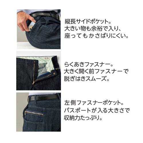 デニムとは思えないソフトなはき心地。動きやすく快適。 バイオウォッシュ加工のやわらかな風合いが、これからの季節に心地いい肌ざわり。股上ゆったりで動きやすく、旅行やお出かけで快適なアクティブパンツです。 ●素材:綿97%、ポリウレタン3% ●仕様:サイドオープンポケット×5、サイドファスナーポケット×1、ウエストホック留め前ファスナー ●洗濯機可 ●日本製 ※ベルトは付属しません。 ※お届けまでに約2週間かかります。 ※オーダー生産のため、ご注文後のキャンセル・返品・サイズ交換等は不良品以外お受けできません。