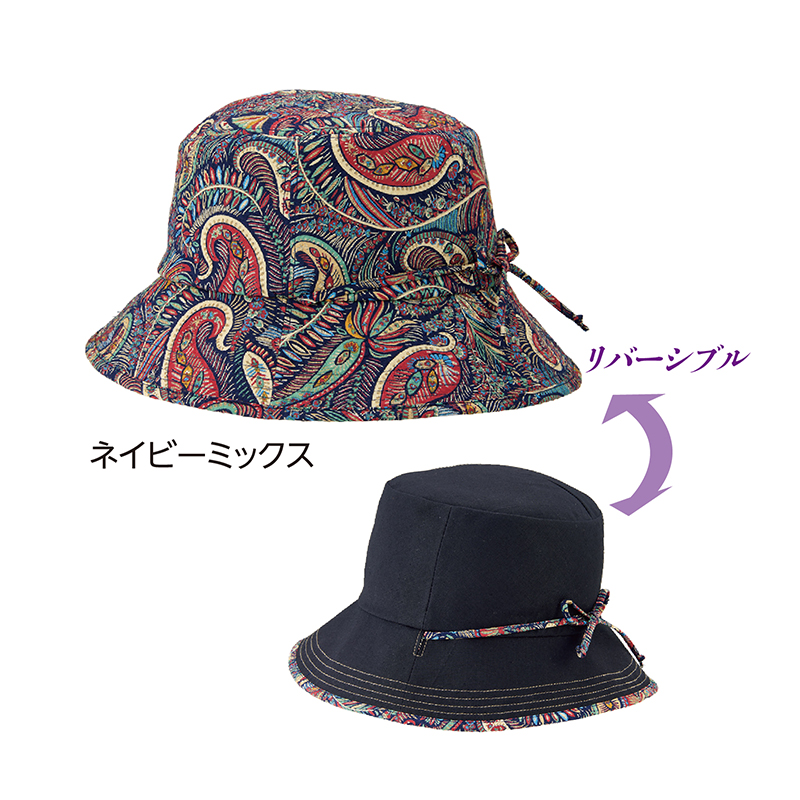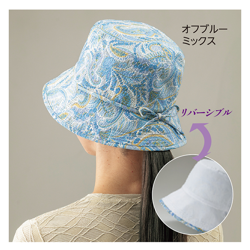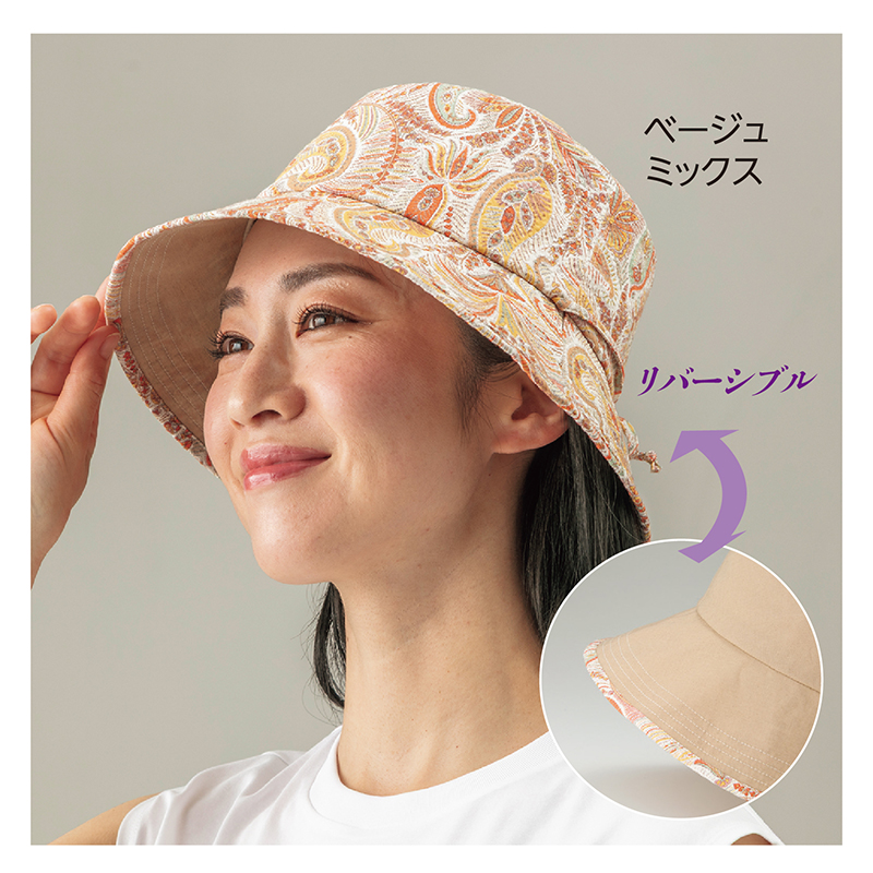 ペイズリー柄と麻混生地。リバーシブルで楽しんで。 美しく繊細なペイズリー柄は英国リバティ社デザイン。無地側は麻の風合いとマットな質感が上品な薄手の麻混生地。飾りリボンは、サイズ調節紐や首紐に変身。●サイズ(約):適応頭周=56~58cm/つばの長さ=前7.5cm(最長)・後6.5cm ●重量(約):56g ●素材:柄地側=綿100%/無地側=綿84%、麻16% ●紫外線遮蔽率:99.5%以上 ●洗濯機可 ●日本製 ※商品の性格上、一点一点柄の出方が異なります。