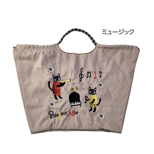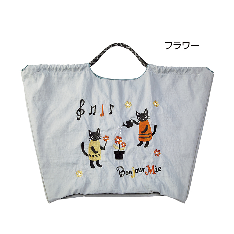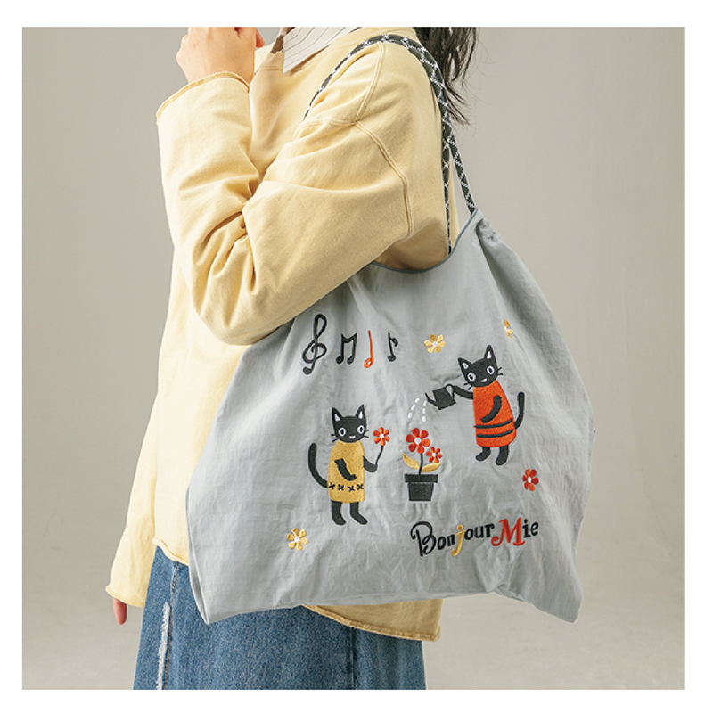 猫さんの楽しい日常を刺繍で表現。たっぷり入る大きめロープバッグ。 かわいい猫さんたちが刺繍されているロープバッグ。内ポケット付で、小物類を入れられます。本体はナイロン製で汚れが落としやすく乾きやすいです。 ●サイズ(外寸・約):幅61×高さ41×厚さ0.5(マチ幅17cm)/ロープ長さ=全長130cm/持ち手範囲20~50cm(着脱不可) ●重量(約):150g ●材質:本体=ナイロン/持ち手=ポリエステル ●仕様:オープンメインコンパートメント(内側にオープンポケット×1) ●中国製