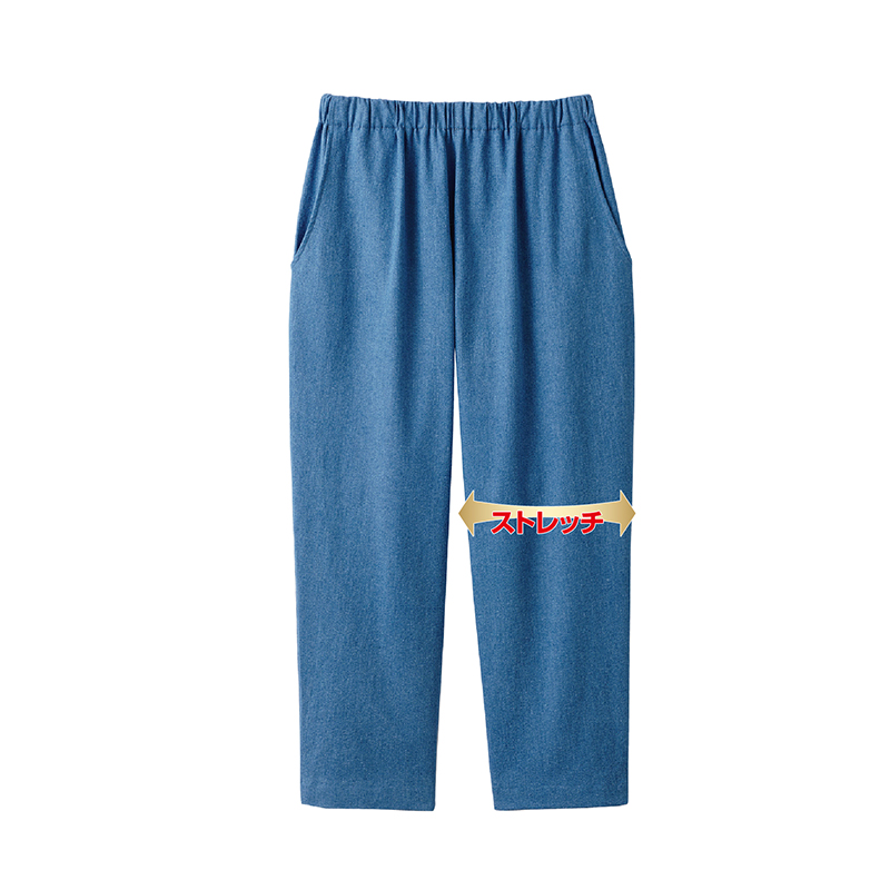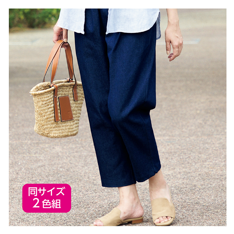 とにかく楽ちん! ゆったり伸び伸びデニム。 太ももゆったり!ウエストゴムでリラックス!腰まわりをふんわりカバー!裾は足元スッキリきれい見えするクロップド丈!ストレッチ素材の伸び伸び楽ちんデニム。 ●素材:綿80%、ポリエステル15%、ポリウレタン5% ●仕様:両脇ポケット、ウエスト総ゴム(ゴム交換口付) ●セット内容:インディゴ、ブルーの同サイズ2色組 ●洗濯機可(ネット使用) ●日本製 ※裾直し後の返品・交換はお受けできません。