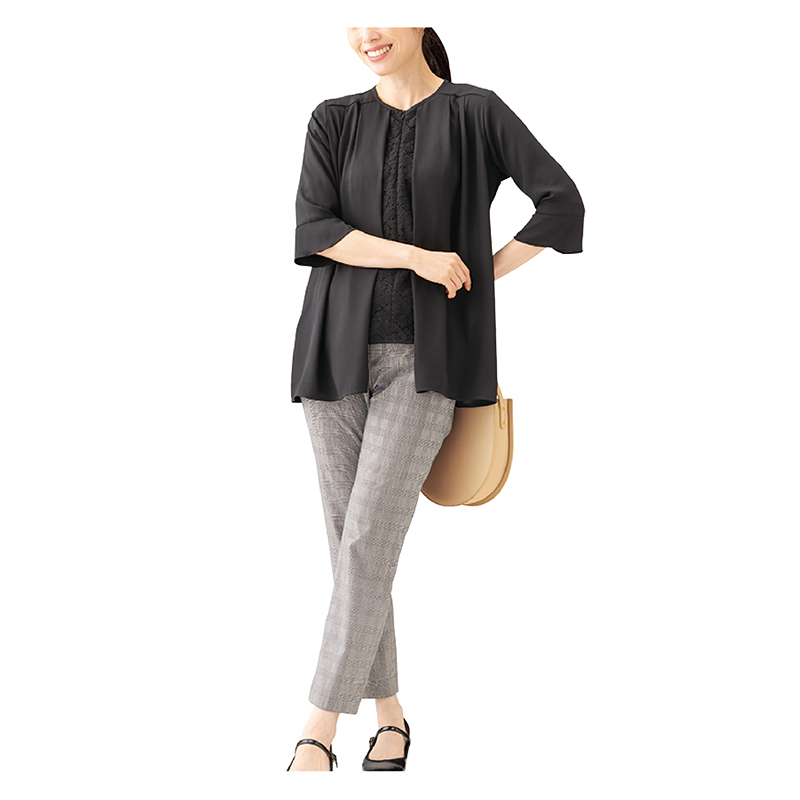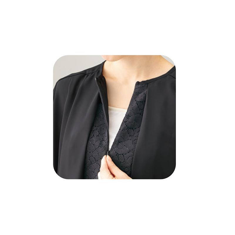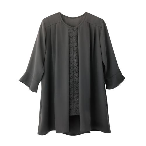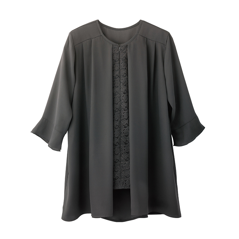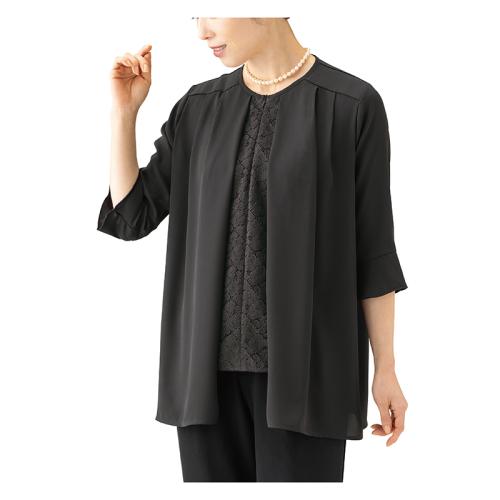 汗ばむ季節のフォーマルに。洗えるエレガントなカットソー。 ツータックのゆったり設計で、着心地が良く、風通しも良好。洗濯機で洗え、お手入れも楽。一枚なのに重ね着に見えるデザインで、エレガンスを演出。 ●カラー:ブラック ●素材:身生地=ポリエステル100%/レース部=綿、ナイロン ●仕様:胸元ファスナー(約17cm) ●洗濯機可(ネット使用) ●中国製 ※アクセサリーは付属しません。 ※商品の性格上、一点一点レース柄の出方が多少異なります。