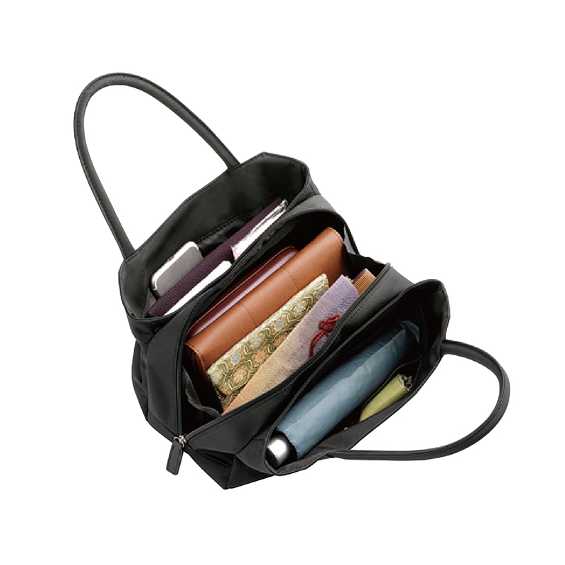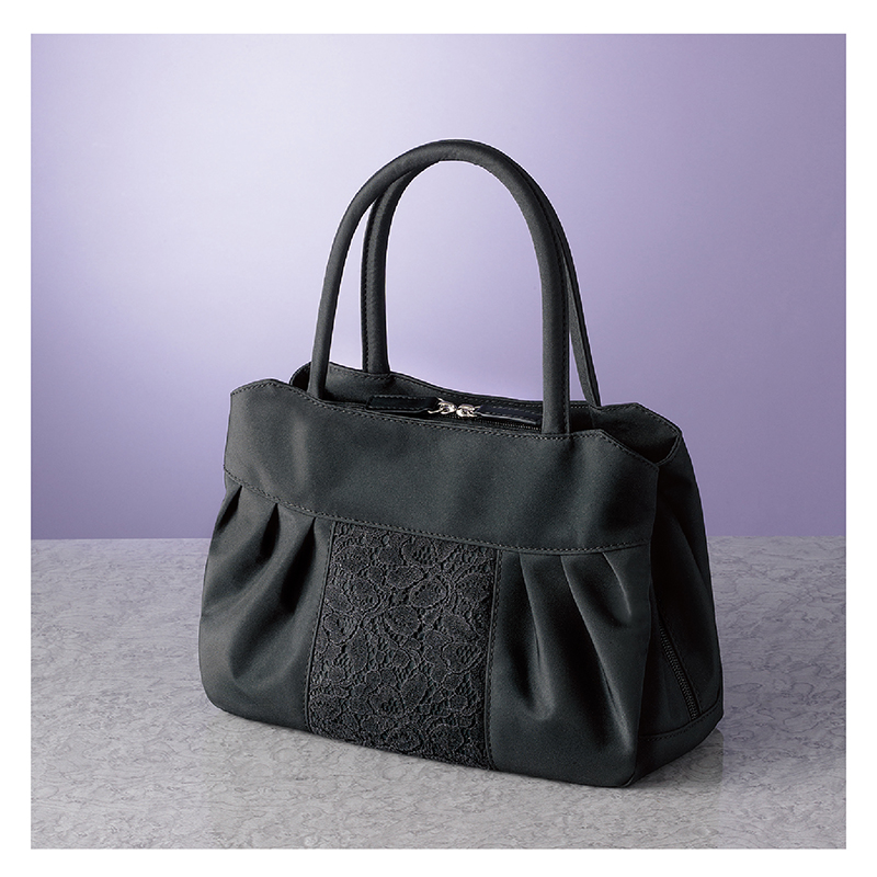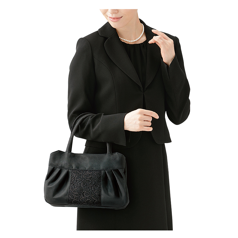 お悔やみには布製バッグが正式。これひとつで全部入ります。 フォーマルスペシャリスト監修。肩掛けもできる、3層式でたっぷり容量の布製フォーマルバッグ。大きく開き出し入れ簡単。サブバッグは不要です。 ●カラー:ブラック ●サイズ(外寸・約):幅28×高さ20×厚さ12cm/持ち手高さ=15cm ●重量(約):300g ●材質:本体=ポリエステル/レース部=綿、ナイロン、レーヨン ●仕様:ダブルファスナーメインコンパートメント/前側・後側=オープンコンパートメント×各1(内部にファスナーポケット×1、オープンポケット×2) ●中国製