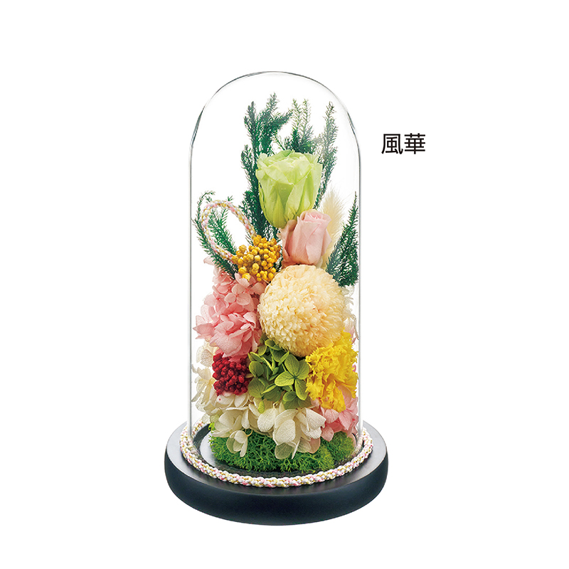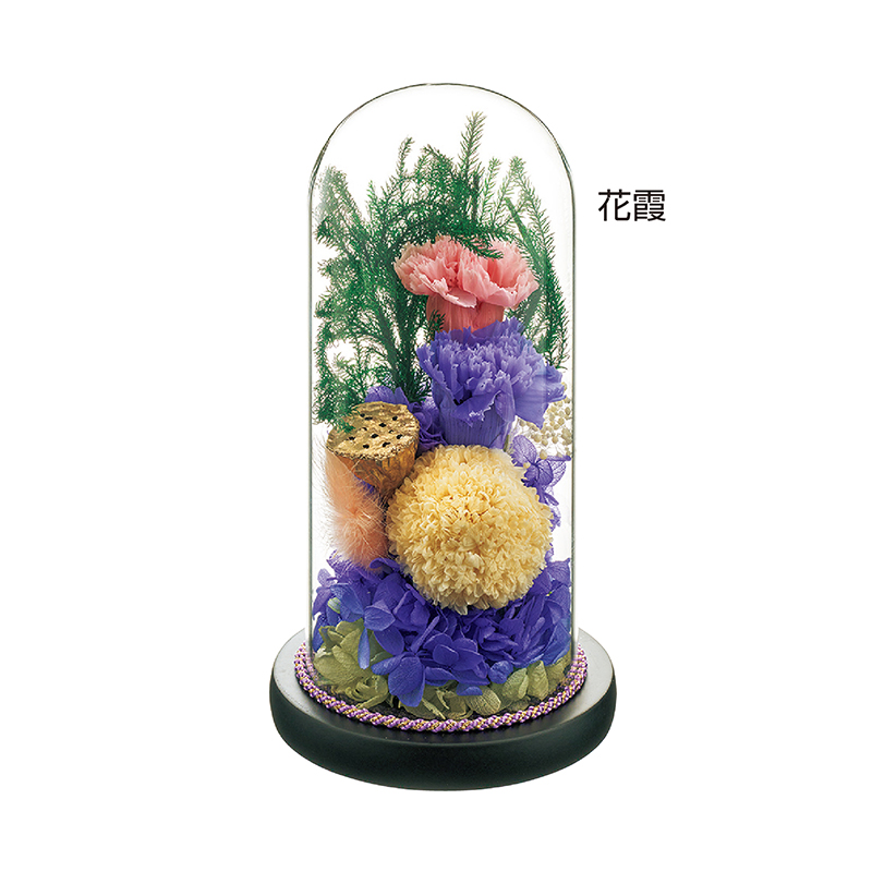 ほこりがつかず、お手入れ簡単。ガラスドーム入りの仏花。 生花に特殊な加工を施したプリザーブドフラワーとドライフラワーを使用。ガラスドーム入りなので、美しい色合いと質感がより長持ちし、手間いらずで仏前を長く美しく彩ります。 ●サイズ(約):直径11.5×高さ21.5cm ●重量(約):350g ●材質:風華=[プリザーブドフラワー]バラ、ライスフラワー、カズラ、カーネーション、ピンポンマム、アジサイ[ドライフラワー]ラグラス/花霞=[プリザーブドフラワー]カズラ、カーネーション、ピンポンマム、アジサイ[ドライフラワー]ラグラス、ハスの実、カスミソウ、ボタンフラワー/花器=ガラス ●中国製 ※商品の性格上、一点一点花の大きさ、色、形等が異なります。 ※一部花材が変更になる場合があります。