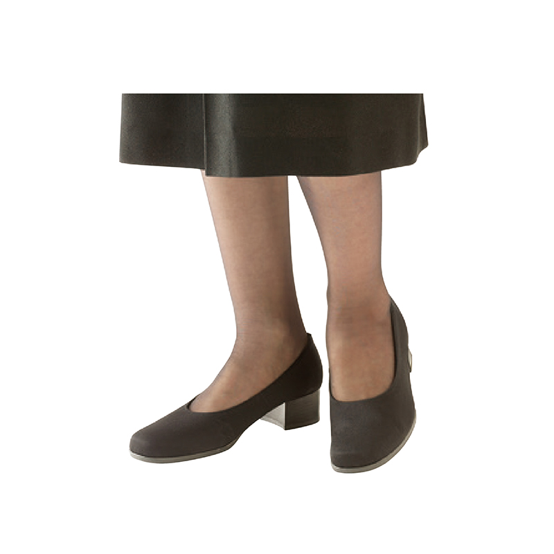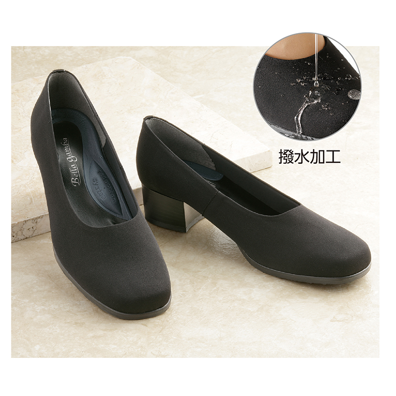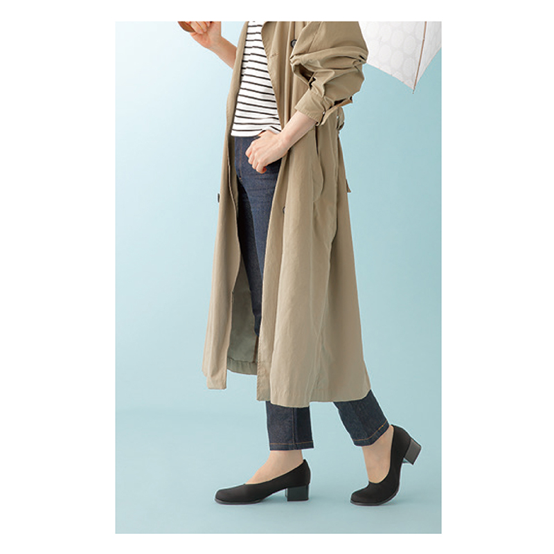 布製だから、軽量。足をやさしく包み込みます。 4Eのワイズに指まわりのクッションで、足先にやさしく、立体インソールで足裏を支えて疲れにくい。撥水加工で雨でも安心です。 ●カラー:ブラック ●ヒール高さ(約):3.8cm ●ワイズ:4E ●重量(約):187g(22.5cm・片足) ●材質:アッパー=ポリエステル/中敷き=合成皮革、EVA樹脂/ソール=合成ゴム ●日本製