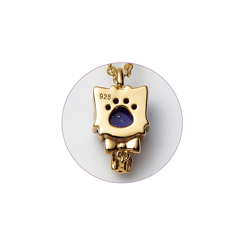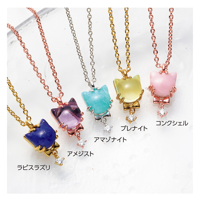 石を支える爪を、ひげに魅せて。かわいい、ねこ型ペンダント。 愛らしいねこのペンダントが胸でキラリ。石を支える爪をひげに見立てました。裏面に肉球がかたどられているのもチャーミング。リボンのチャームが揺れて輝きます。 ●サイズ(約):トップ=縦16×横7.8×厚さ5mm/チェーン長さ45cm(アジャスター5cm含む) ●重量(約):2.8g ●材質:トップ=シルバー925(ロジウム、イエローゴールド、ピンクゴールド仕上げ)、アマゾナイト(処理石)、アメジスト、ラピスラズリ、プレナイト、コンクシェル(各1石約1ct)、キュービックジルコニア(共通1石約0.01ct)/チェーン=真鍮(ロジウム、イエローゴールド、ピンクゴールド仕上げ) ●留め具:引き輪式 ●日本製(天然石=中国製) ※商品の性格上、一点一点風合い等が異なります。 ※お届けまで約3週間かかる場合があります。