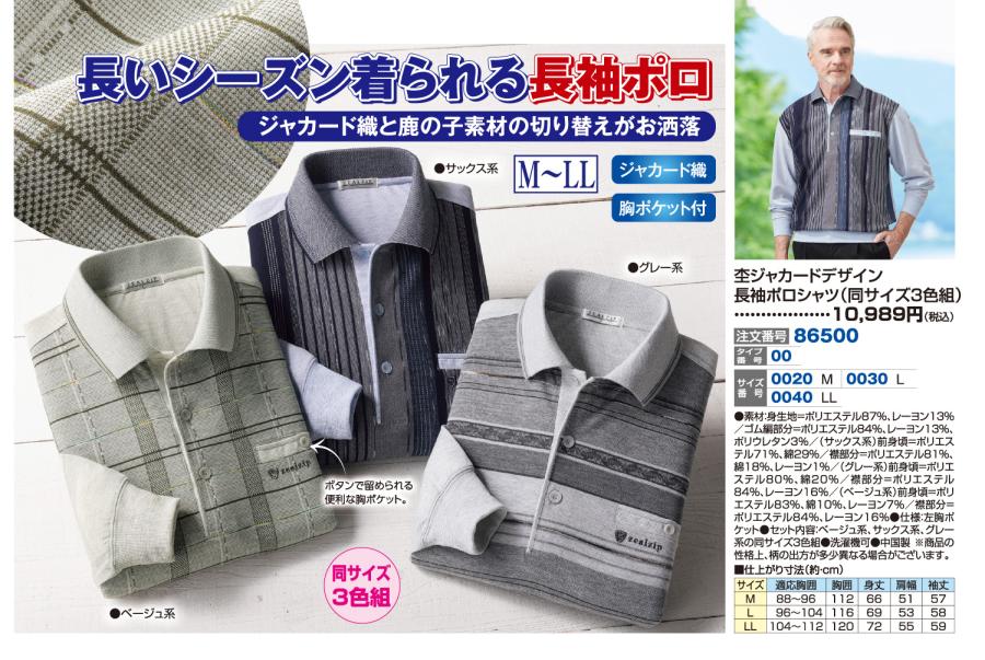 3. 杢ジャカードデザイン長袖ポロシャツ(同サイズ3色組)