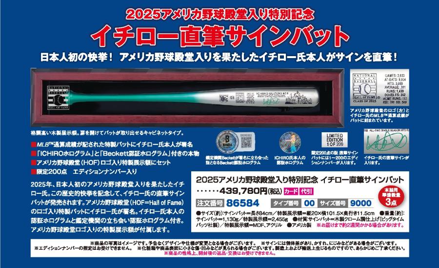 ●サイズ(約):サインバット=長さ84cm/特製展示額=縦20×横101.5×奥行き11.5cm ●重量(約):サインバット=1130g/特製展示額=2455g ●材質:サインバット=木製クローム調仕上げ(ビッグタイムバッツ社製)/特製展示額=MDF、アクリル ●アメリカ製 ※商品の写真はイメージです。予告なくデザインや仕様が変更となる場合がございます。 ※サインには個体差があり、かすれ、にじみなどがある場合がございます。 ※エディションナンバーの指定はお受けできません。 ※化粧箱や商品表面に小さな傷・凹みなどが見られる場合がございます。製造上および輸送上生じるものですので、あらかじめご了承ください。 ※商品の性格上、開封後の返品・交換はお受けできません。 ※お届けまで約2週間かかる場合があります。