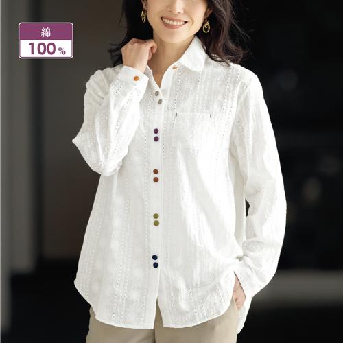 カラーボタン使い綿刺しゅうブラウス