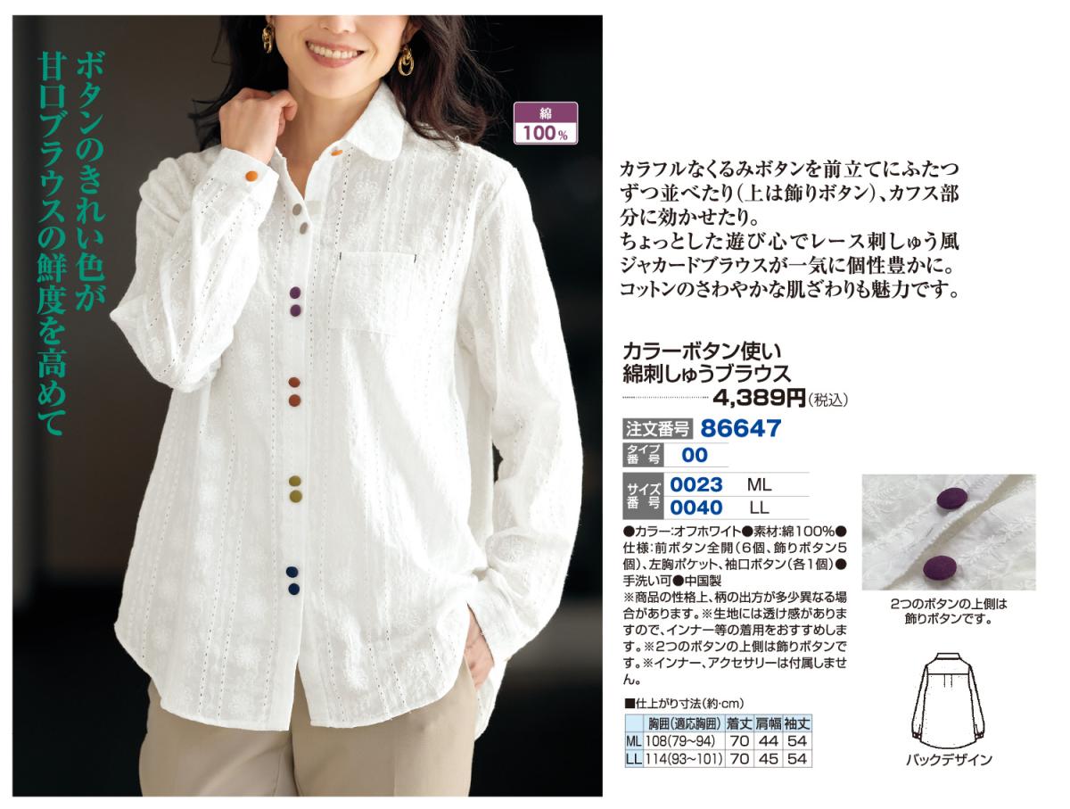3. カラーボタン使い綿刺しゅうブラウス