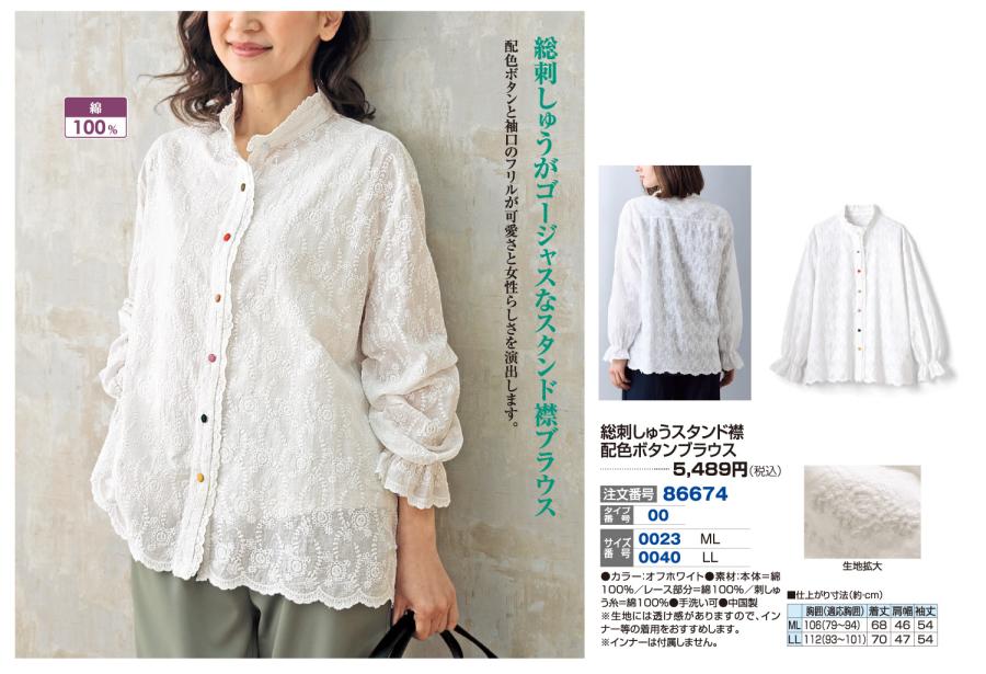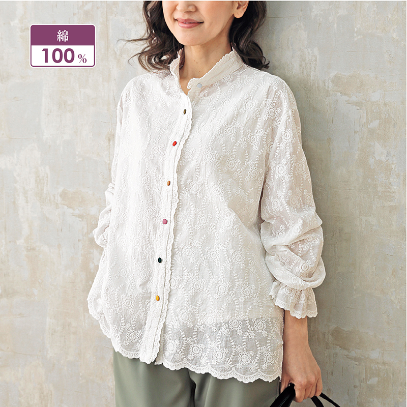 3. 総刺しゅうスタンド襟配色ボタンブラウス