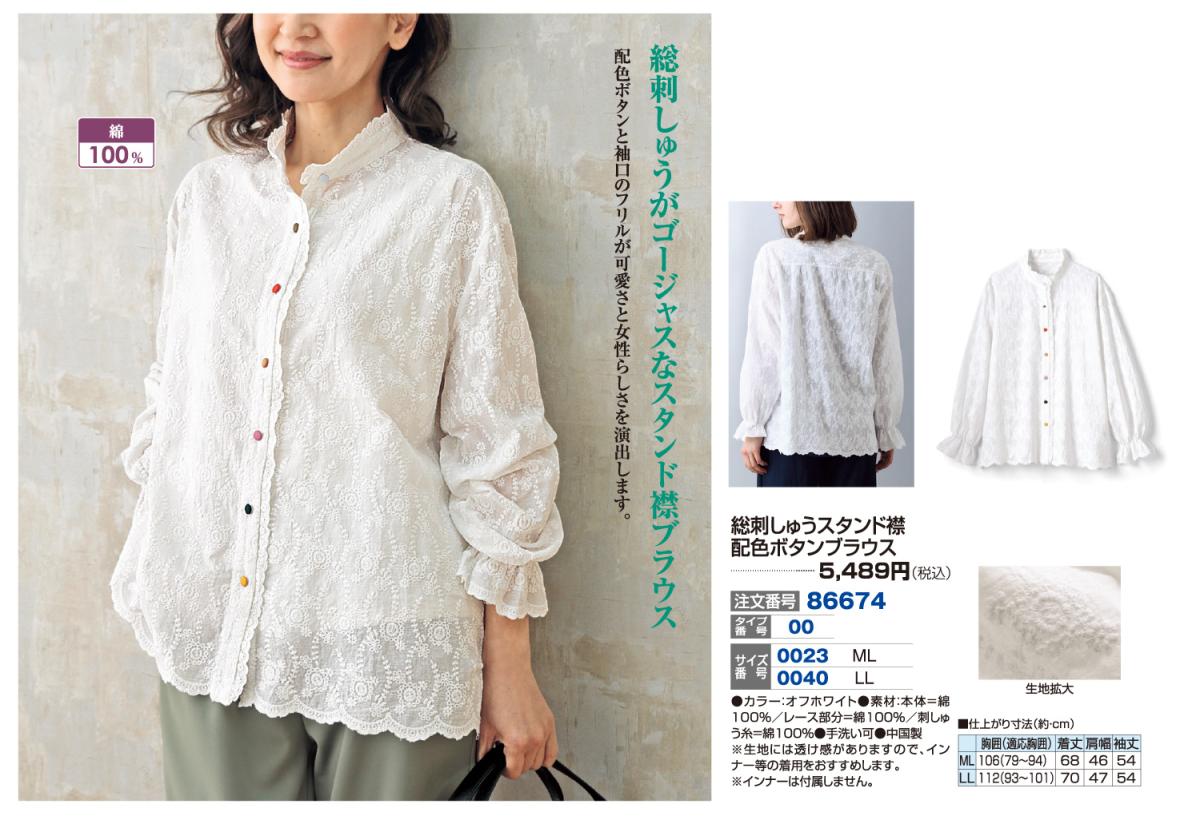 総刺しゅうスタンド襟配色ボタンブラウス