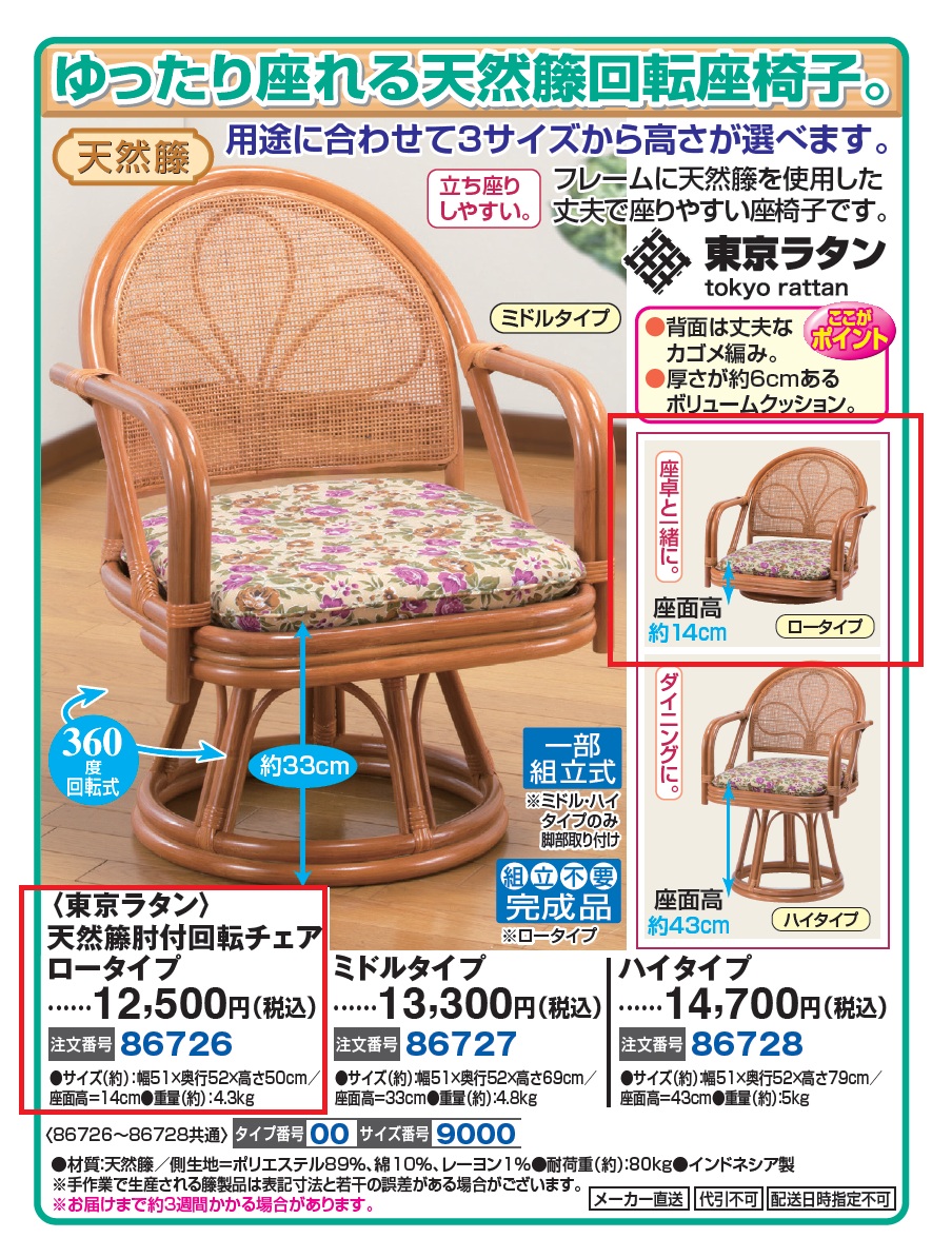 3. 〈東京ラタン〉天然籐肘付回転チェア ロータイプ