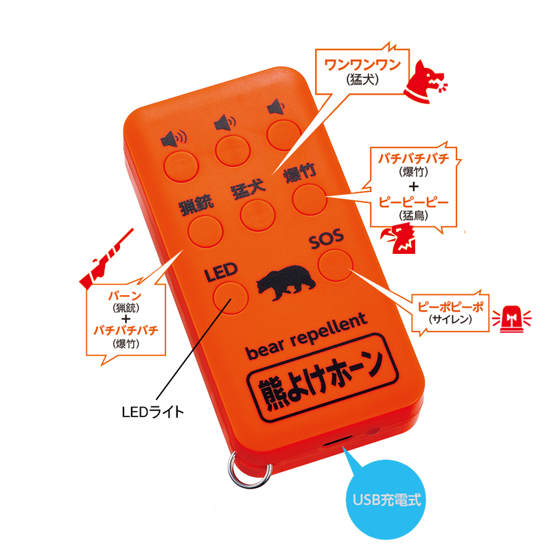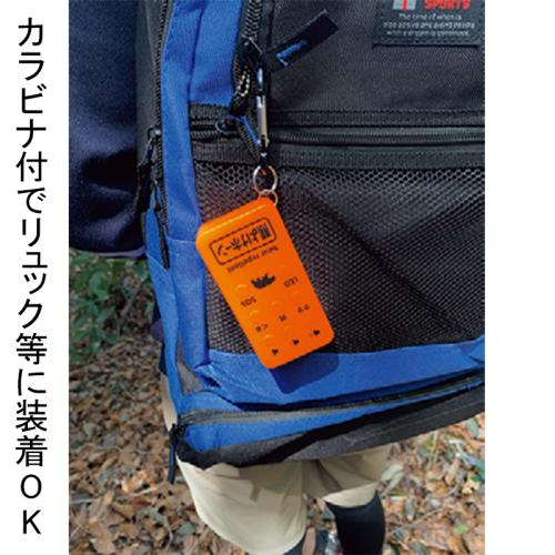 最大110dBの爆音で熊遭遇を回避。 音量は3段階。SOSボタンでサイレンを鳴らすことも可能です。 ●カラー:オレンジ ●サイズ(約):幅4.5×奥行9×高さ1.85cm ●重量(約):59g(カラビナ含む) ●材質:ABS樹脂、他 ●電源:内蔵リチウムイオン充電池(USB充電) ●充電時間(約):2時間 ●連続作動時間(約):最大10時間(音量などにより変動) ●音圧(約):最大110dB ●付属品:カラビナ、USBケーブルType-C ●中国製 ※ご使用後の返品・交換はお受けできません。