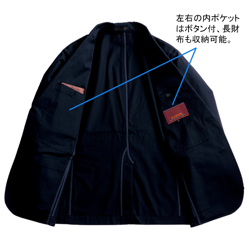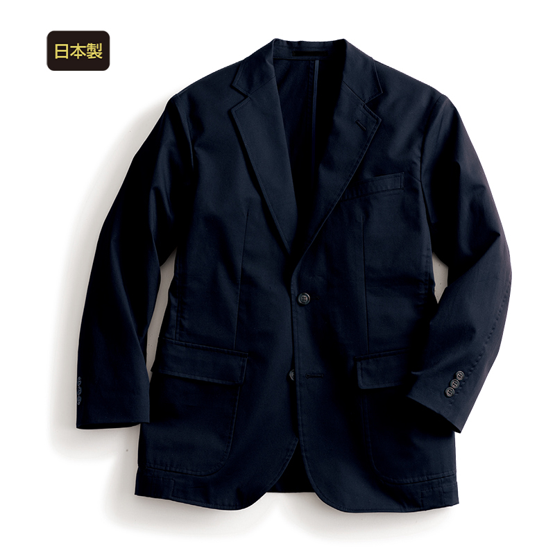 薄手、軽量でかさばらず旅行に好適。 綿100%で快適な肌ざわり。薄手で軽量の生地を使用し身頃を1枚仕立てにすることでかさばりにくく、外出や旅行にも重宝です。 ●カラー:ダークネイビー ●素材:本体=綿100%/袖裏=ポリエステル100% ●仕様:左胸ポケット、両脇ポケット、内ポケット×2、センターベント、裏地なし ●ドライクリーニング可 ●日本製