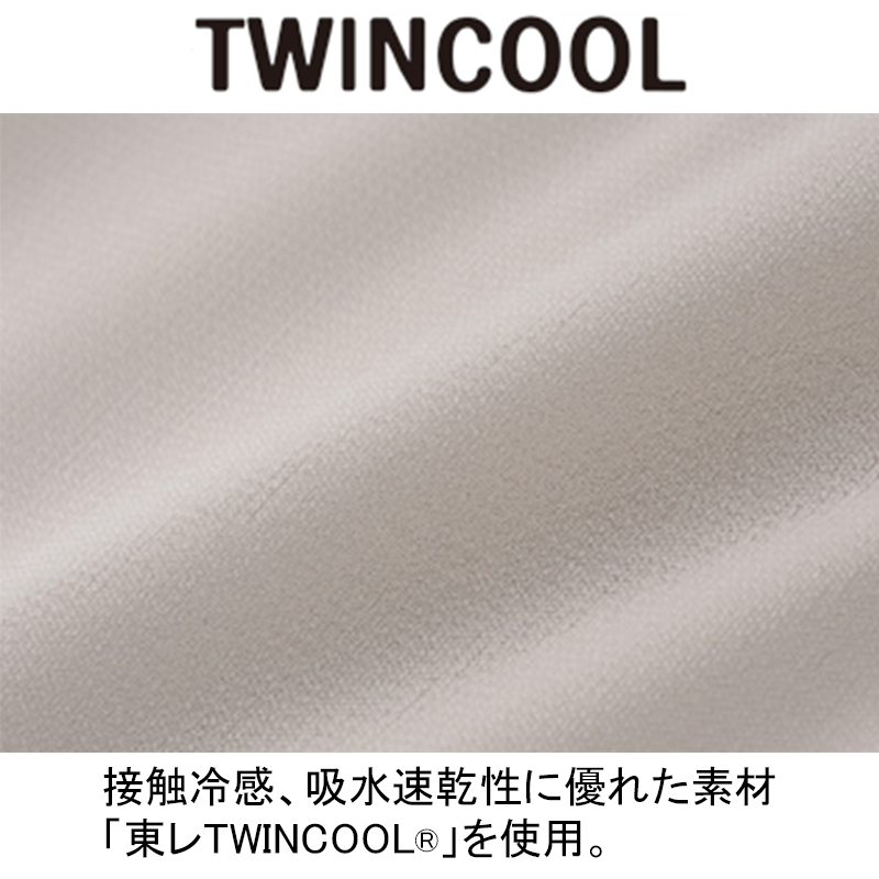 接触冷感素材で夏もひんやり。 ●素材:ポリエステル100% ●手洗い可 ●日本製 ※「TWINCOOL」はトーレアドバンスト マテリアルズ コリア インコーポレイテッドの登録商標です。