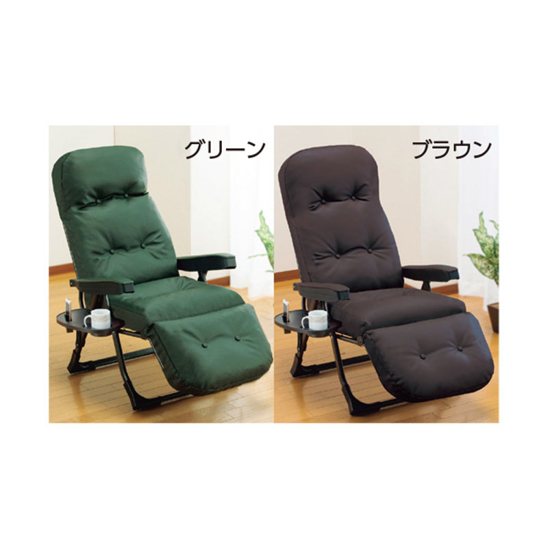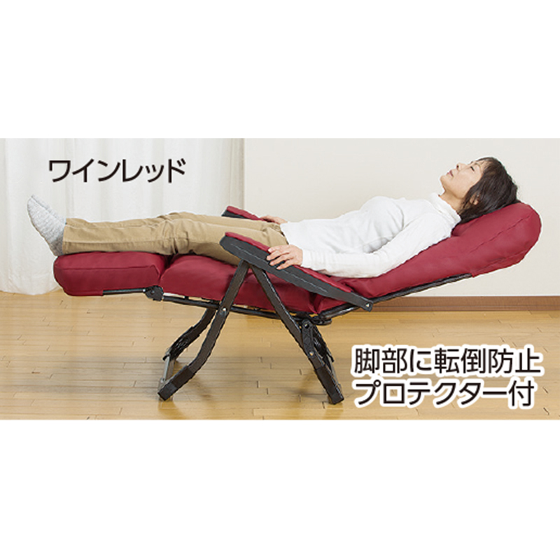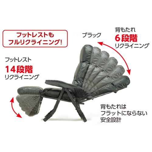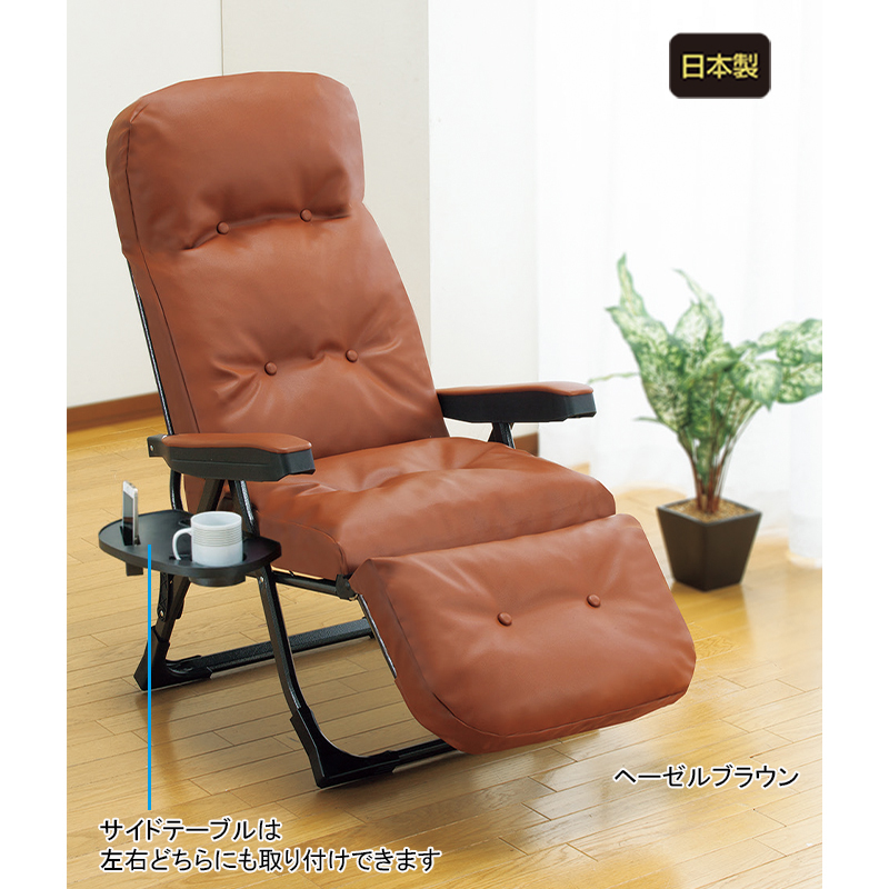リクライニングで全身リラックス。厚手クッションに包み込まれる快感! 背もたれ・座面のSバネ構造に、クッション材は国内メーカーのウレタンを採用。高いクッション性で、リラックスできます。 フルリクライニングにすれば、全身リラックス! ●サイズ(約):使用時=幅60×奥行86~154×高さ62~106cm、座面高41cm/収納時=幅60×奥行50×高さ94cm ●重量(約):10.5kg ●耐荷重(約):80kg ●材質:本体=スチール(エポキシ樹脂粉体塗装)/張り地=合成皮革(表地)、ポリエステル(裏地)/クッション材=ウレタンチップ、鋼製S字バネ/サイドテーブル=ABS樹脂 ●仕様:背もたれ6段階リクライニング、フットレスト14段階リクライニング ●付属品:サイドテーブル ●日本製 ※お届けまで約3週間かかる場合があります。