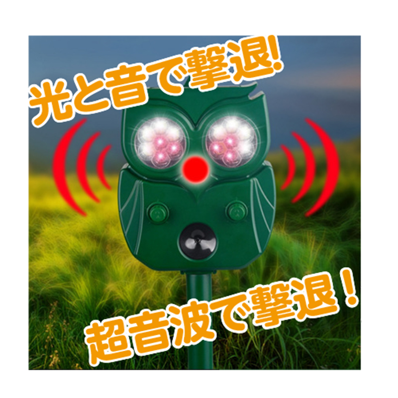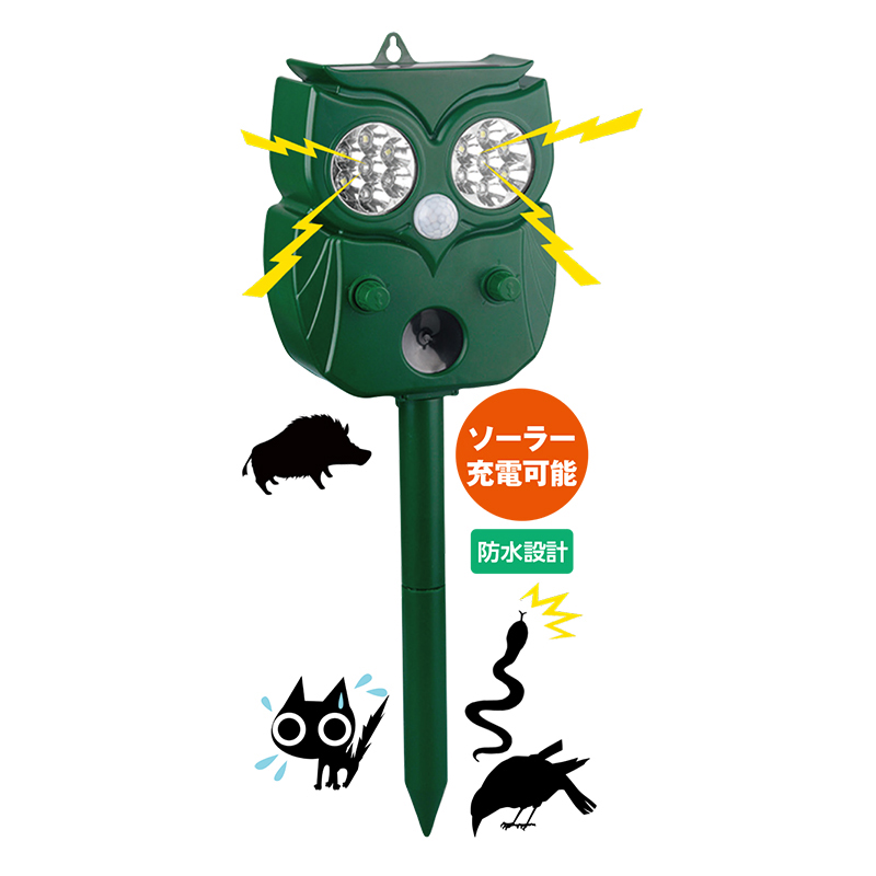電源不要。困る害獣を撃退! センサーが検知して光と音と超音波で撃退。さまざまな動物に対応可能。防水設計です。 ●サイズ(外寸・約):幅14×奥行7.5×高さ17.5cm/ポール+杭=直径2.3×長さ24cm ●重量(本体・約):280g ●材質:ABS樹脂 ●電源:リチウムイオン充電池(3.7V/1200mAh) ●連続使用時間(約):8時間 ●充電時間(約):USB=5~6時間/ソーラー=7~9時間 ●出力音量(約):最大85dB(音量調整可) ●仕様:警告音、LEDライト点滅、超音波周波数=13.5~45kHz、有効範囲=約217度、有効距離=約1~7m、入力電圧=5V1A、防水等級IPX3 ●付属品:ポール、杭、接続パーツ、USB充電ケーブル ●中国製 ※ご使用後の返品・交換はお受けできません。