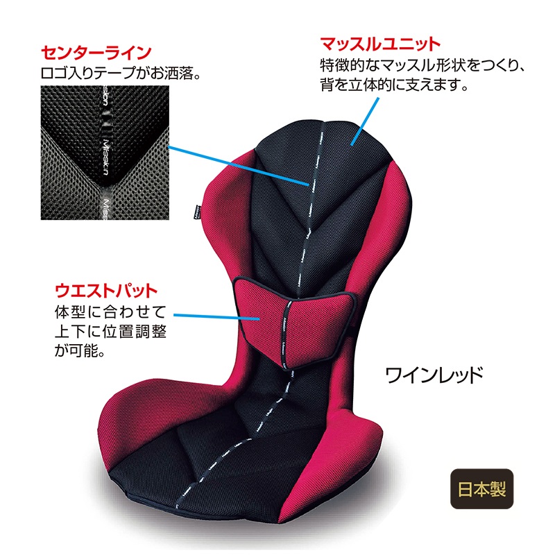 長時間のドライブをラクに快適に。 体を包み込むように支えて体圧を分散。デザインにも自信あり。 ●サイズ(約):幅54×長さ100×厚さ(最大)5cm ●重量(約):600g ●素材:表地=ポリエステル(ダブルラッセル立体メッシュ生地)/中材=発泡ポリエチレン(酒井化学製ミナフォームマルマル)/裏地=ポリエステル、ウレタン ●仕様:シート固定用上部ストラップ、サイドストラップ(固定用パッド付) ●手洗い可 ●日本製 ※本商品は背もたれと座面の間に隙間があるシートに適応します。 ※本革シート車、ハイバックシート車には取り付けできません。