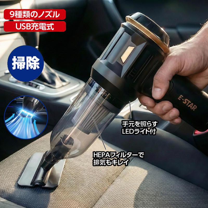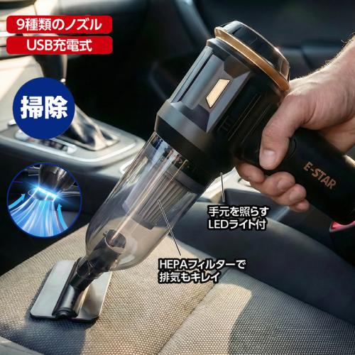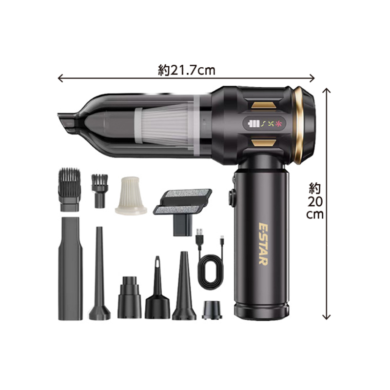 吸引力は驚きの20000pa! 充電式コードレスなので取り回しがラク。空気入れや火起こしなどにも使えて大活躍。 ●カラー:ブラック ●サイズ(約):幅21.7×高さ6.8×奥行20cm ●重量(約):450g ●材質:ABS樹脂、他 ●定格電圧(約):11.1V ●集塵容量(約):0 . 2 L ● 電源:リチウムイオン電池( 1 1 . 1 V 、2000mAh、USB Type-C充電) ●充電時間(約):3時間 ●連続使用目安時間(約):フル充電で30分(弱モード時) ●消費電力:1 0 0W ●吸引力(約):20000pa ●仕様:3段階スイッチ(弱 /中 /強)、LEDライト ●付属品:ノズル9種、Type-C充電ケーブル、セミハードケース ●中国製 ※ACアダプターは付属しません。 ※ご使用後の返品・交換はお受けできません。