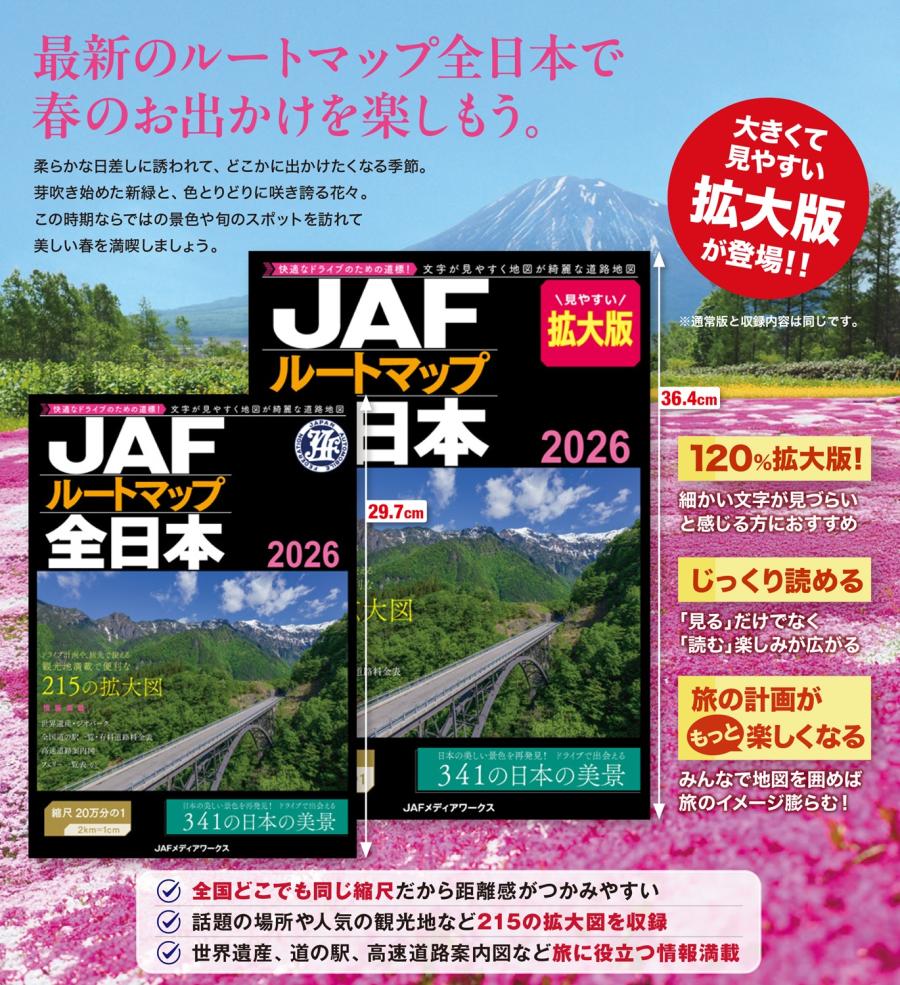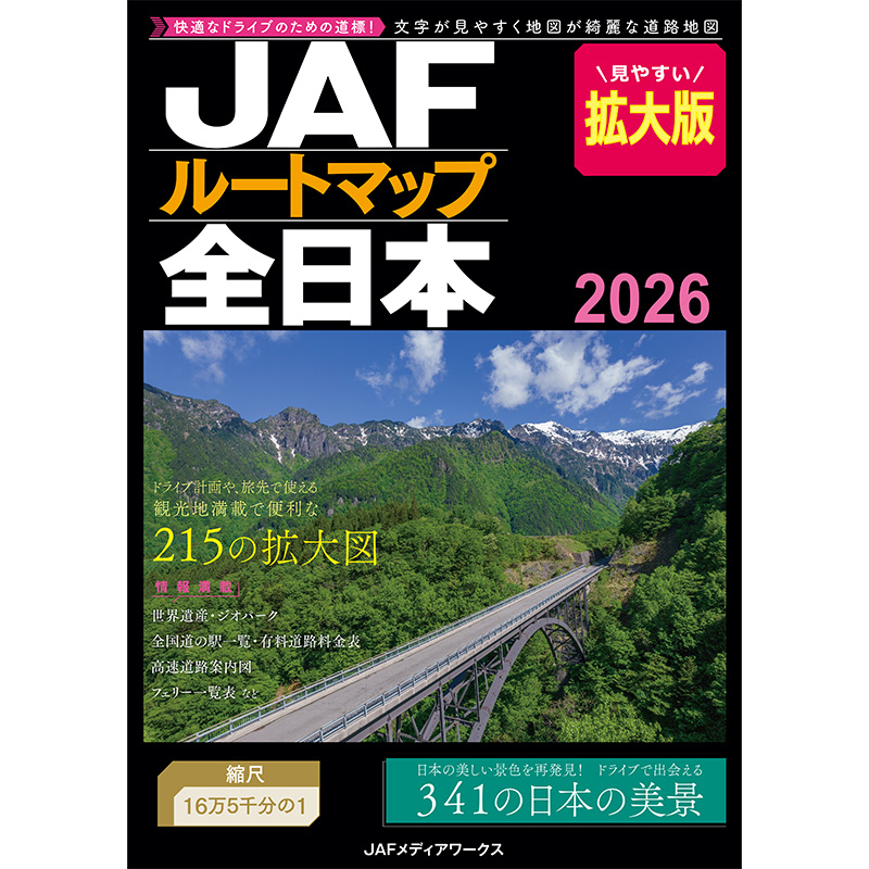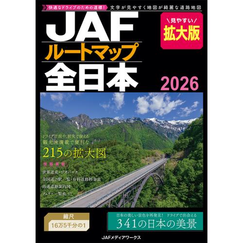 見やすさを選ぶという選択。地図を見る時間が、快適になる。 毎年春に新年版を発行する、ロングセラーのルートマップ全日本に最新の2026年版が登場! A4版の内容はそのままに、約120%拡大したB4サイズにしました。視認性が高まり、探す・確認する・比較するがスムーズに。使うほど違いを実感できます。 現地でもプランニングでも役立つ拡大図は215図! 主要観光地や主要都市の拡大図は全国版道路地図としては最大級の掲載数! 全国どこでも縮尺を1/20万で統一! 北から南、西から東、同じ縮尺だから距離感がつかみやすく、プランニングがしやすい。 プランニングに役立つ情報が充実! 「全国道の駅一覧」「高速道路案内図」「フェリー一覧表」「日本の美景」などプランニングに不可欠な情報が満載! ドライブで出会える絶景を厳選した「日本の美景」も341か所掲載!! 毎年更新するから情報が新鮮! 道路情報だけでなく、ドライブプラン作成に役立つ観光案内も最新の情報を掲載。 ●縮尺:1/20万 ●サイズ:B4判 (縦364mm×横257mm×厚さ21mm) ※掲載の図・表紙等は製作中のものです。仕様が変更になる場合がございますので、ご了承ください。 ※落丁・乱丁以外の返品・交換はお受けできません。